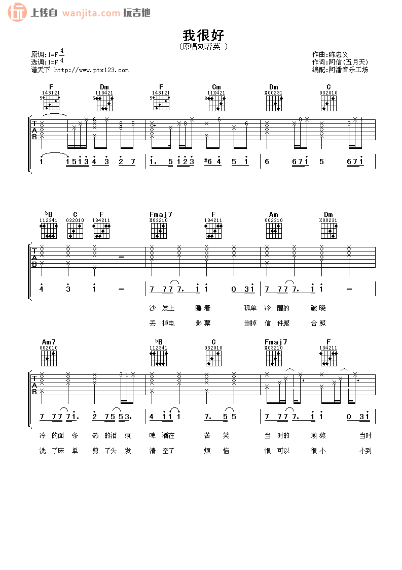 曲谱介绍: 刘若英《我很好》吉他谱,由阿潘音乐工场制谱,总共3张高清图片谱,原调为F调,选用F调指法,节拍4/4拍,不使用变调夹,弹唱难度初级。