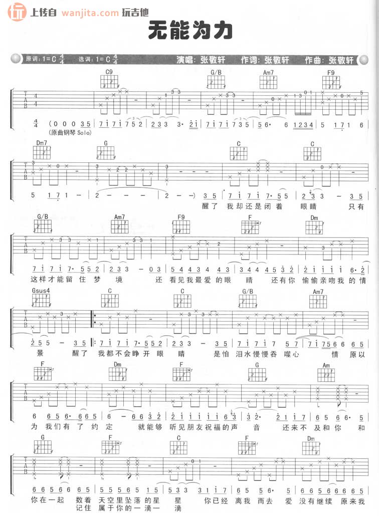 无能为力吉他谱 - 张敬轩 - C调吉他弹唱谱