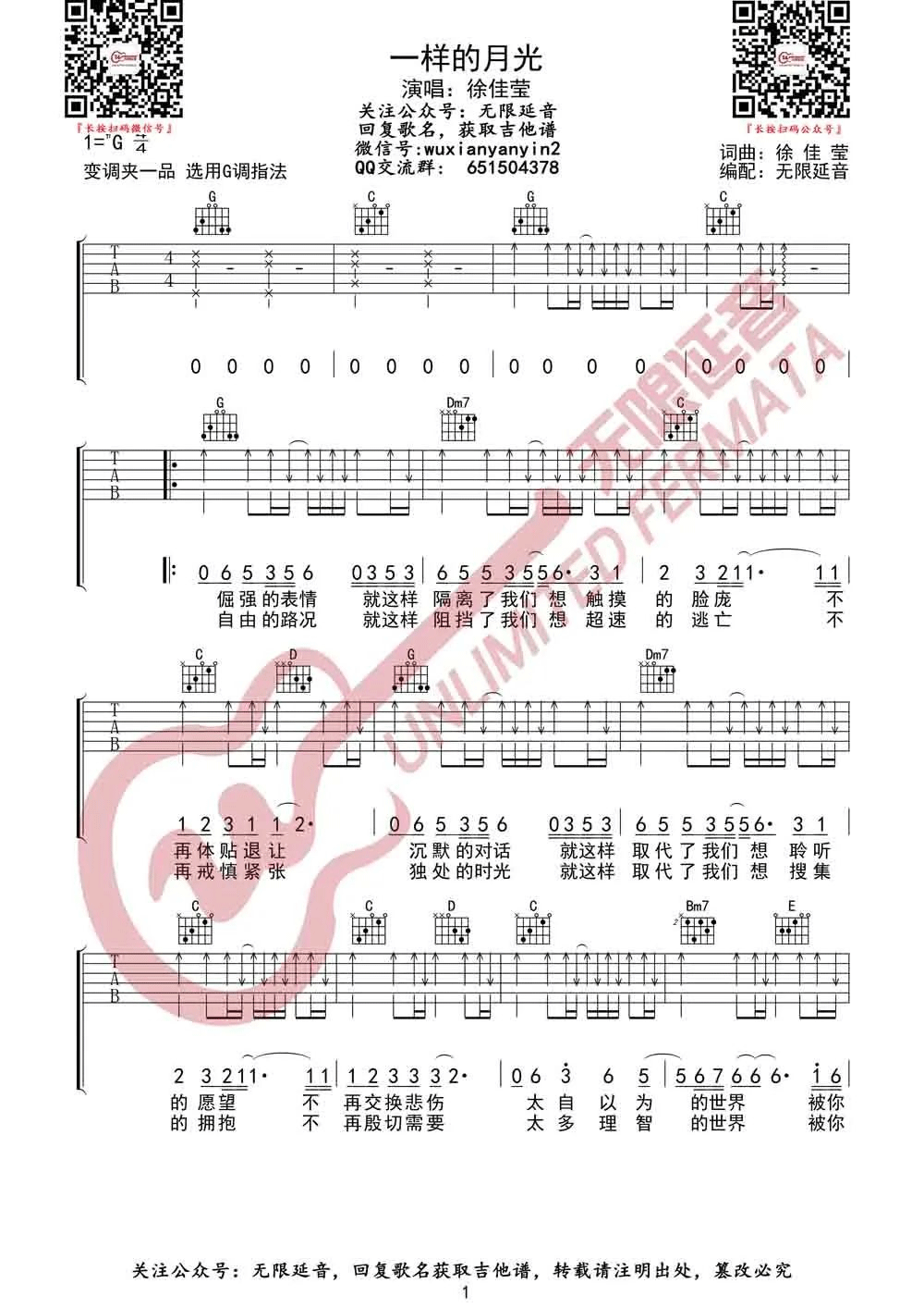 曲谱介绍: 徐佳莹《一样的月光》吉他弹唱谱,采用G调指法编配原版,共有3张高清图谱。