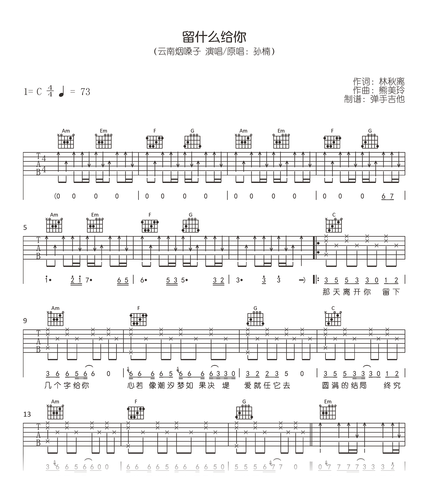 曲谱介绍: 《留什么给你》吉他弹唱谱,C调原版和弦指法编配,完整六线谱共两张高清图片。
