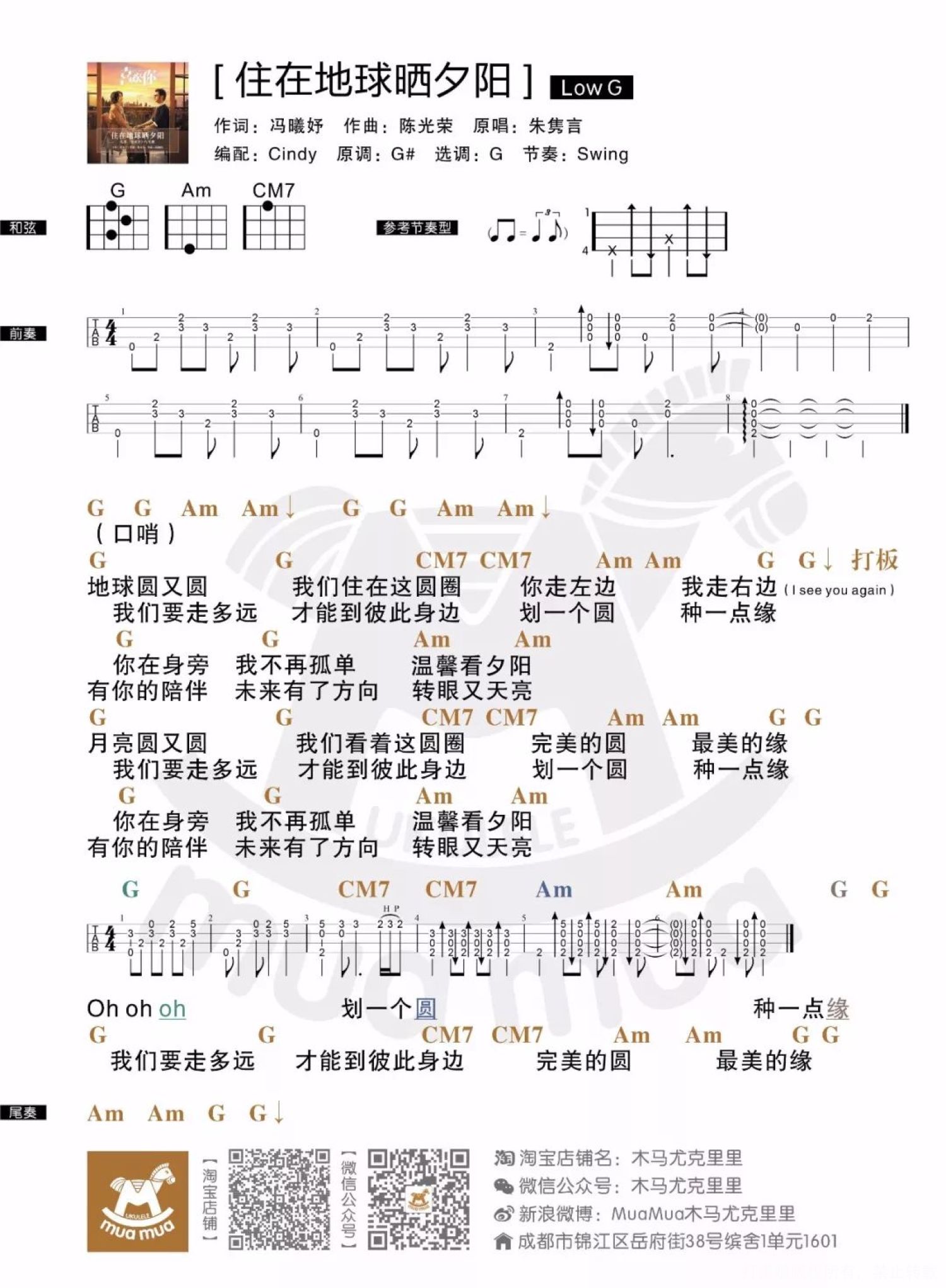 曲谱介绍: 《住在地球晒夕阳》尤克里里谱 原调G# 变调夹夹1品回原调 女生也可以用变调夹 调整到适合自己的音高 视频中有一些加花 因为比较简单 谱上也不好描述 就没写出来 喜欢的同学可以照着 视频里的指法弹 这首歌如果用Low-G弦会更好听 但小编试了一下 其实普通G弦也没啥大问题 愉快地弹吧!