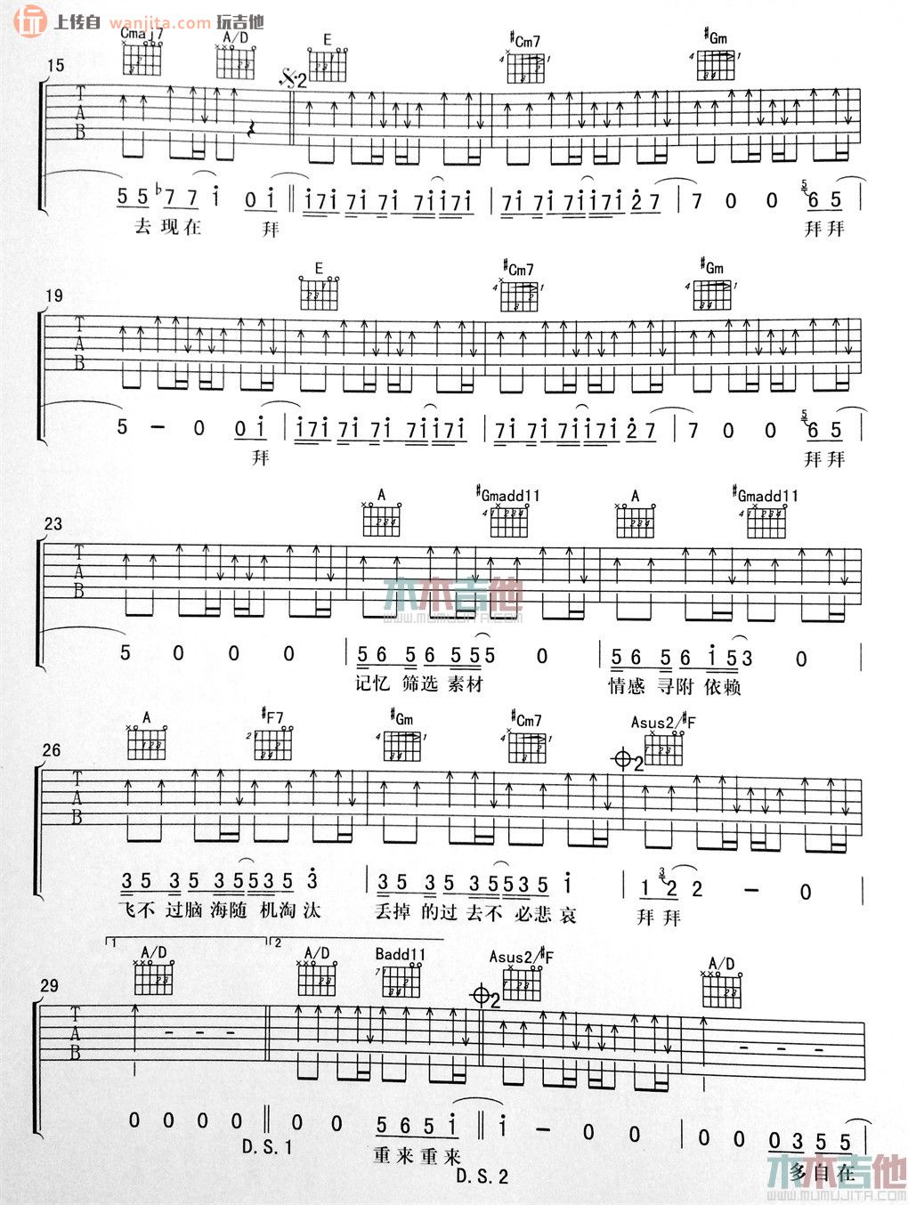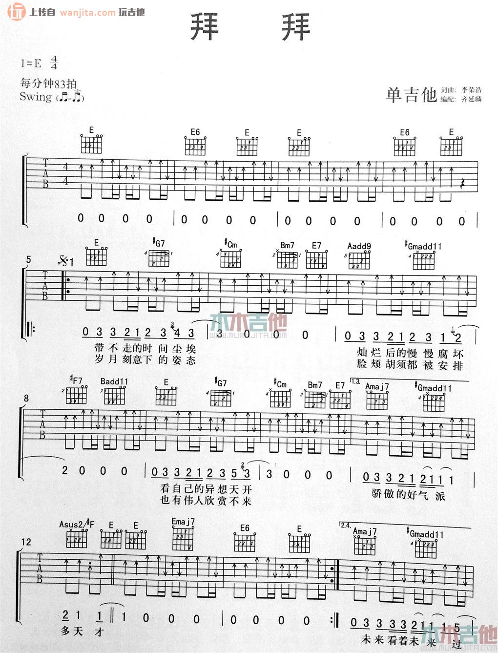 曲谱介绍: 《拜拜》吉他谱E调,不使用变调夹,齐延麟编配制谱。这张谱子全片采用了扫弦,因此,对于这首歌来说最重要的部分应该是节奏的把控,但从谱子上来说,一首简单的适合新手学习的歌曲。