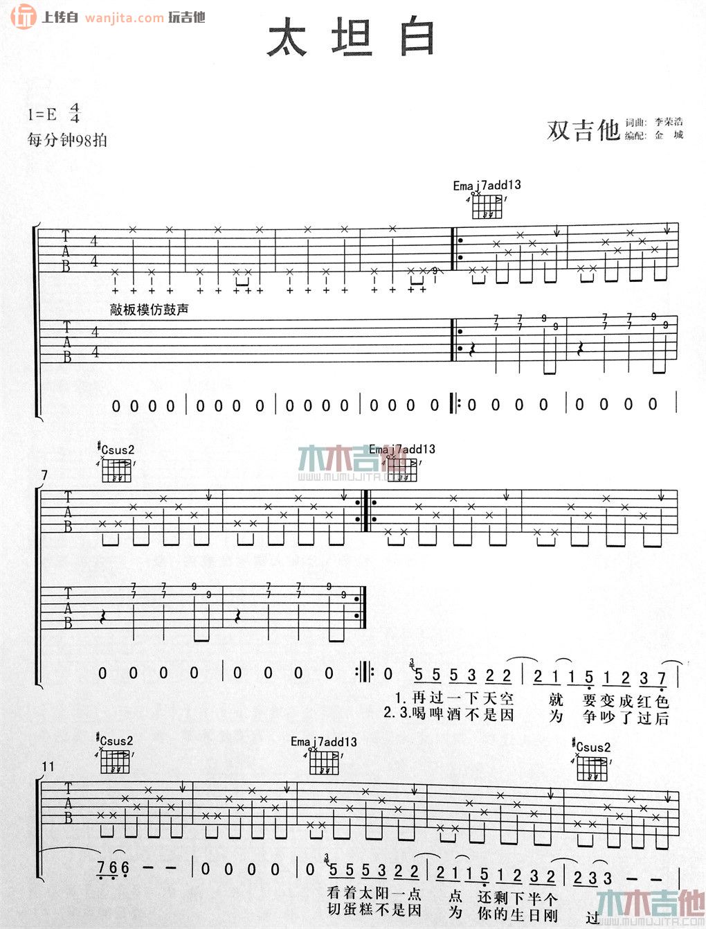 曲谱介绍: 李荣浩《太坦白》吉他弹唱谱,采用E调指法编配,共有4张高清图谱。