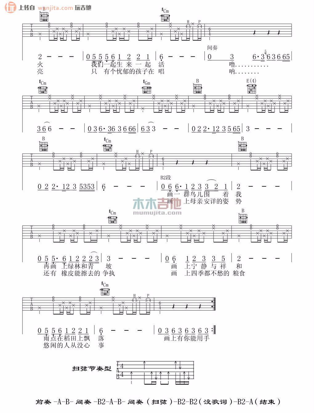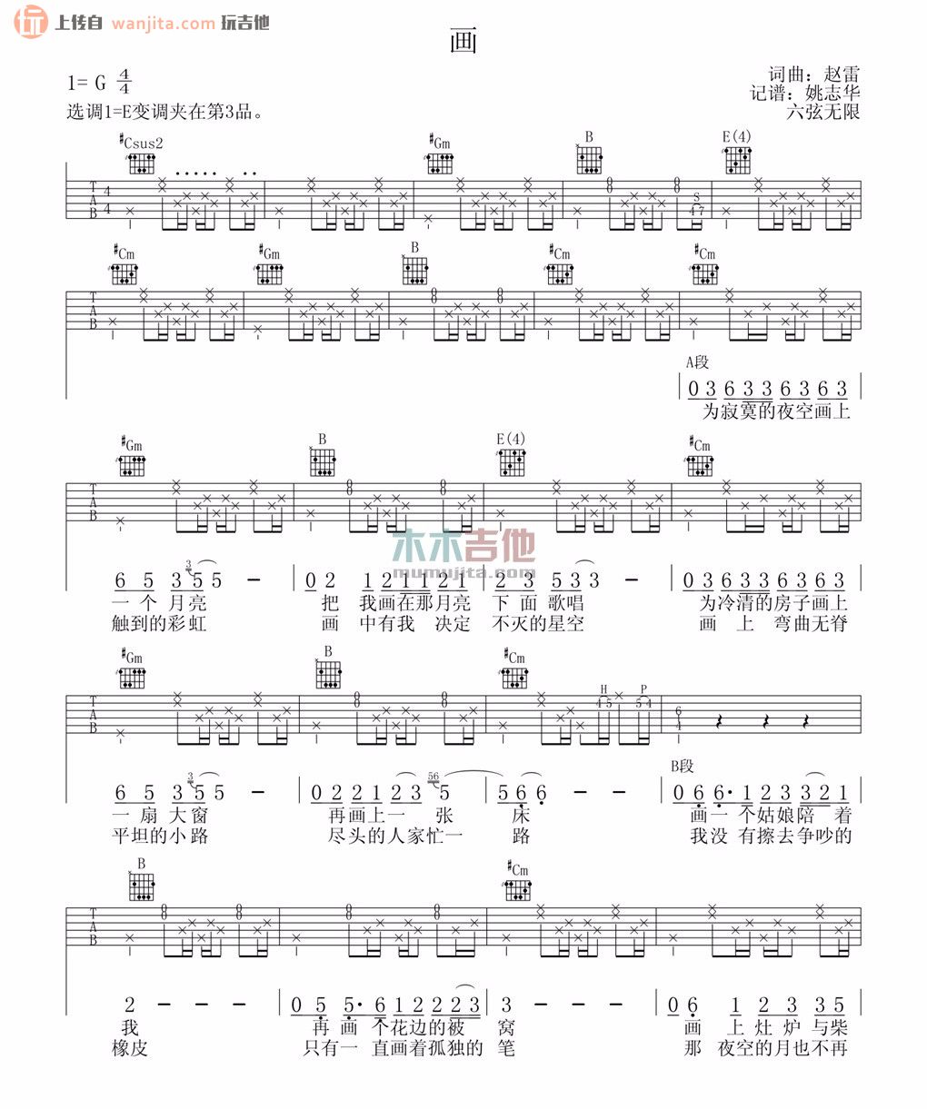 曲谱介绍: 《画》吉他谱G调,选调E,变调夹夹三品,姚志华制谱。这首民谣歌曲在演奏上和他的好听度成正比,比较难的一首歌,不适合新手练习,大家可以根据自己的技巧多多练习。