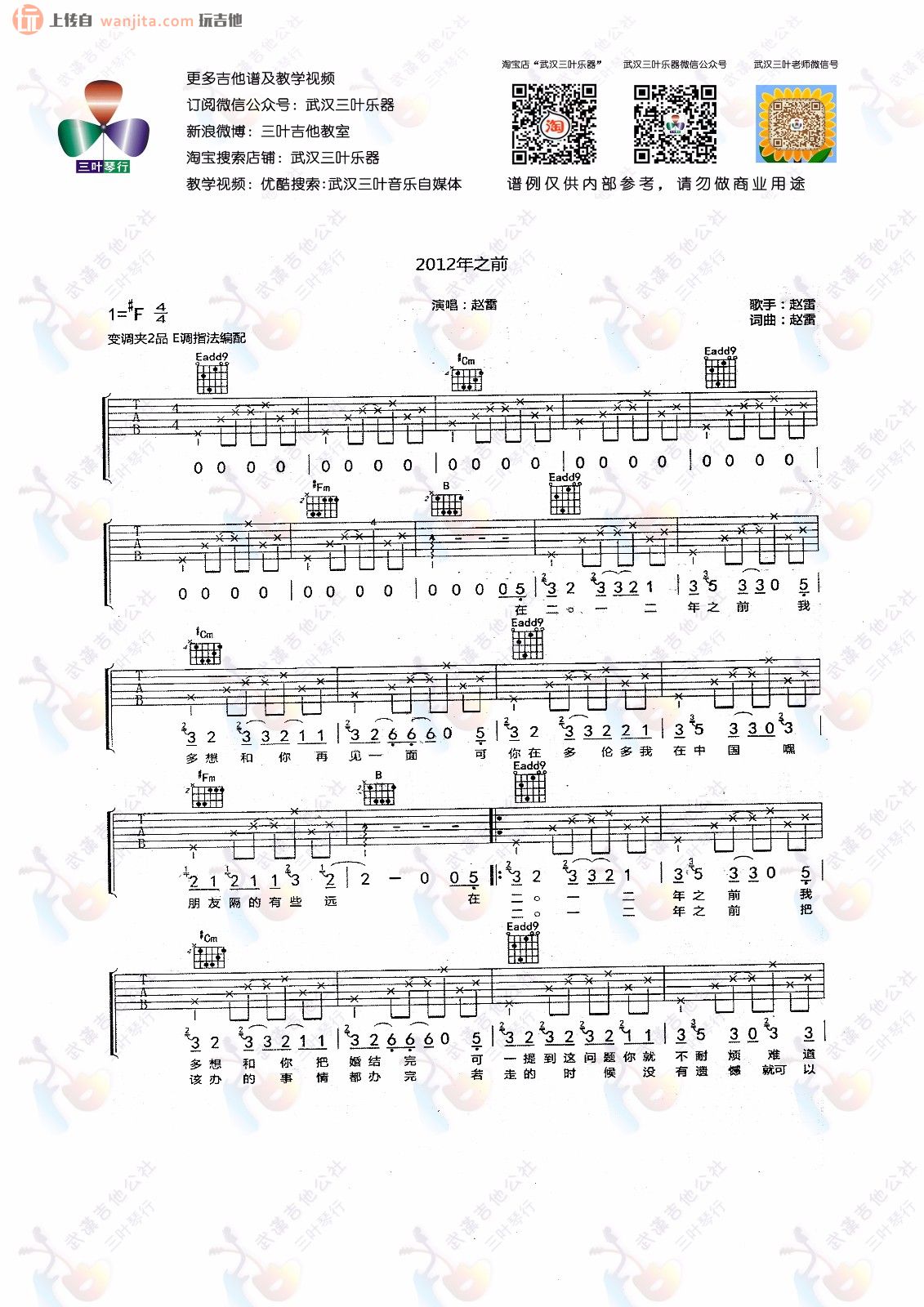 曲谱介绍: 《2012年之前》吉他谱F调,变调夹夹2品,E调指法编配。这张谱子难度中等,但要多注意歌词中的情感展现,需要有一定的唱歌技巧,像这种狂放派的歌曲推荐大家多多尝试。适合进阶练习的一张谱子。