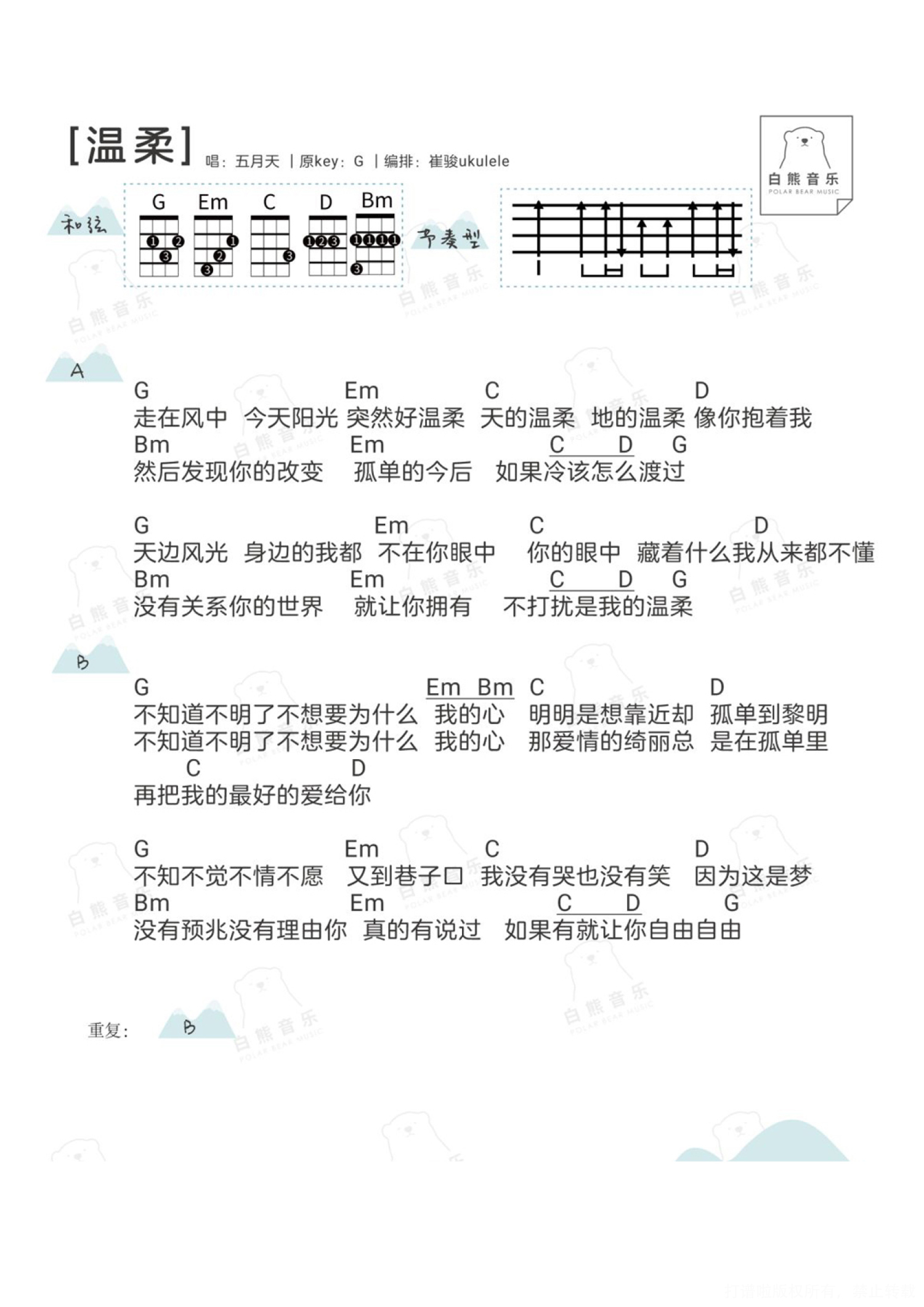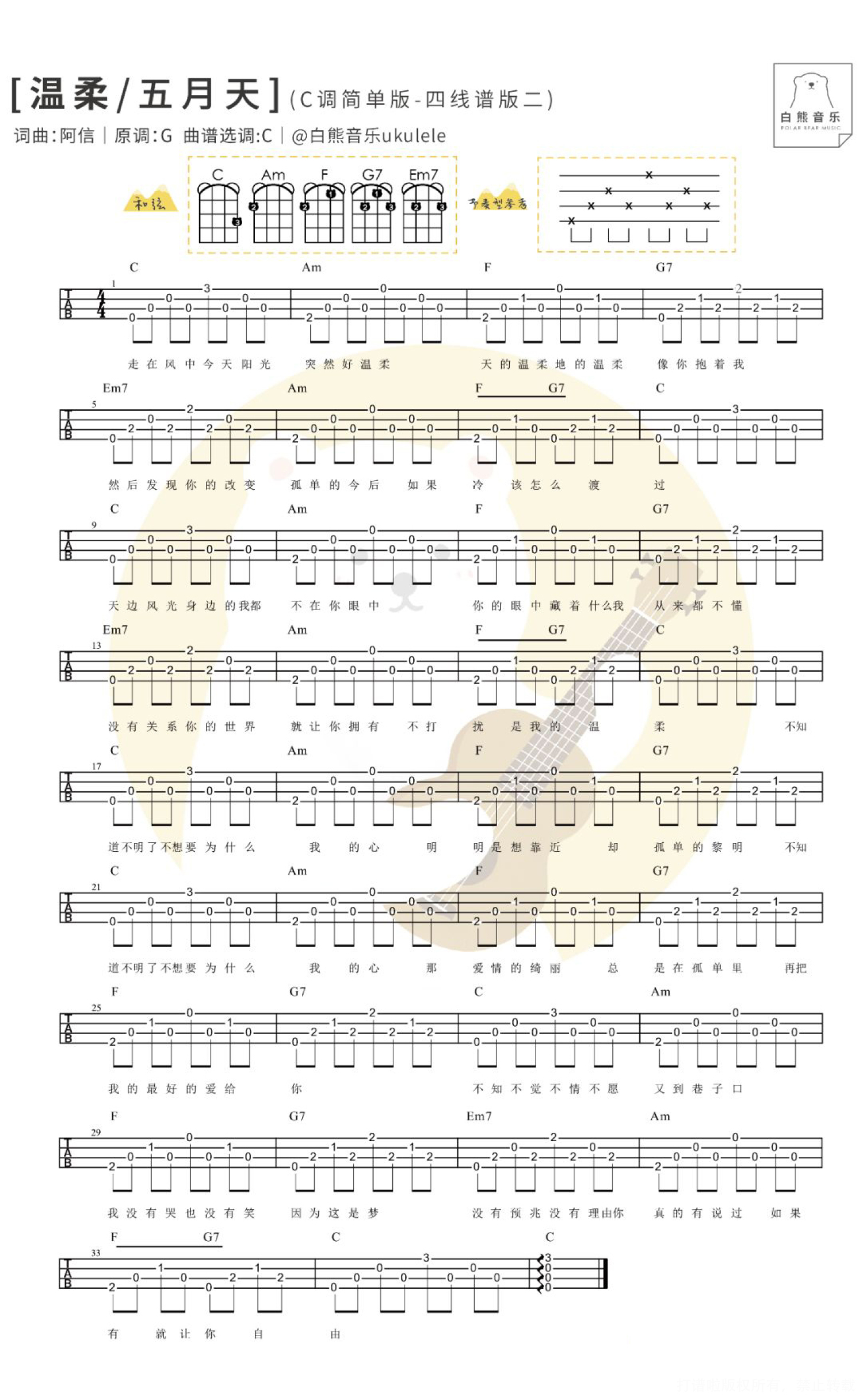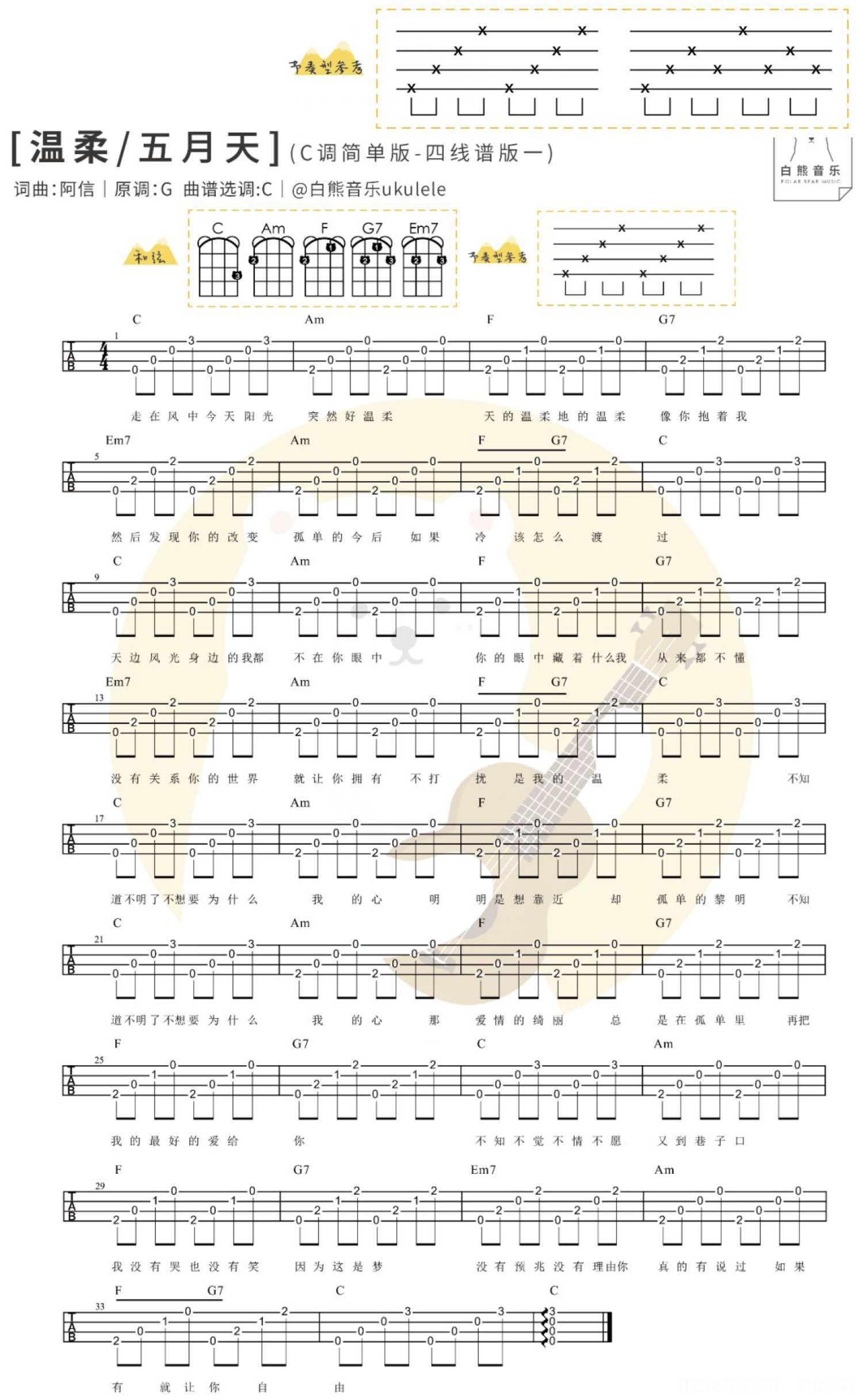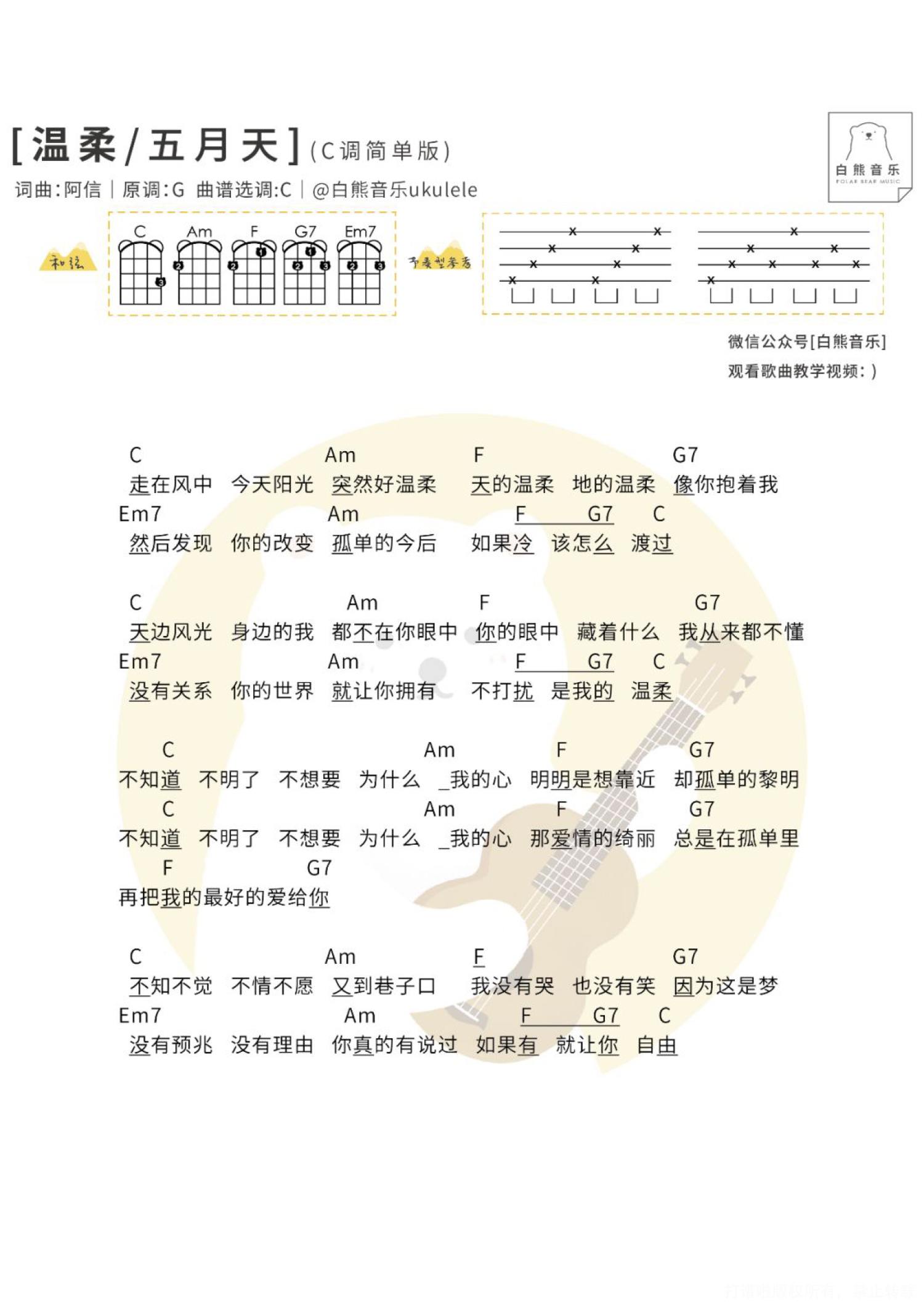 曲谱介绍: ∥简单一曲 ╳ 新手必学∥ 经常后台有人会问有什么歌曲比较简单,适合初学的新手弹奏?? 其实有些歌曲老师会编得简单,有的丰富会好听很多,但是对于初学者来说也会困难一些,一开始弹奏不了, 所以贴心的小白熊决定! 不定期发一些简单编排的谱子,针对零基础新手录制的歌曲教学 快速又简单地教会你弹唱一首歌哦!! ※注意:是简单的谱子!(以后也可能会有丰富的版本,敬请期待) 如果是完全零基础新手,建议一定要先看我们的 零基础系列弹唱教学(点击直达) 零基础系列指弹教学(点击直达)   简单版弹唱|〈温柔〉五月天 ◎〈温柔〉几乎每一场演唱会都能听到的,几乎每个去过现场的都能被感动哭(至少五迷是这样的哈哈..),每次纸片雨大面积轰炸的时候再配上温柔的歌词和口白,真的都忍不住热泪盈眶!    尤克里里弹唱教学&谱 Tips|小提示 1、本次教学编排的是C调,比较简单,用到的节奏型是非常常用的分解节奏型,可以学起来,一般适合抒情的慢歌; 2、要先把弹的部分练习得非常熟练再加入唱噢,可以在练习弹的时候先哼着歌,这样后期加入唱的部分会更容易哟;   Ukulele简单弹唱教学|@草帽呀   尤克里里谱 1、C调简单四线谱   2、C调简单和弦谱   3、G调和弦谱 可以把教学视频里讲解到的分解节奏型也代入到G调版本里~