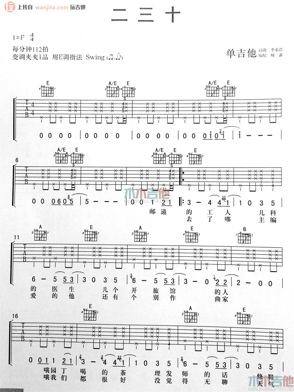 曲谱介绍: 《二三十》吉他谱原调F调,变调夹夹1品,用E调指法弹奏,杨鑫编配制谱。这张感触颇深的歌曲谱子并不像想象中的那么难,大家学习的时候要注意右手的节奏型的转化,这算是比较难的一部分了。这首歌也比较适合新手学习。