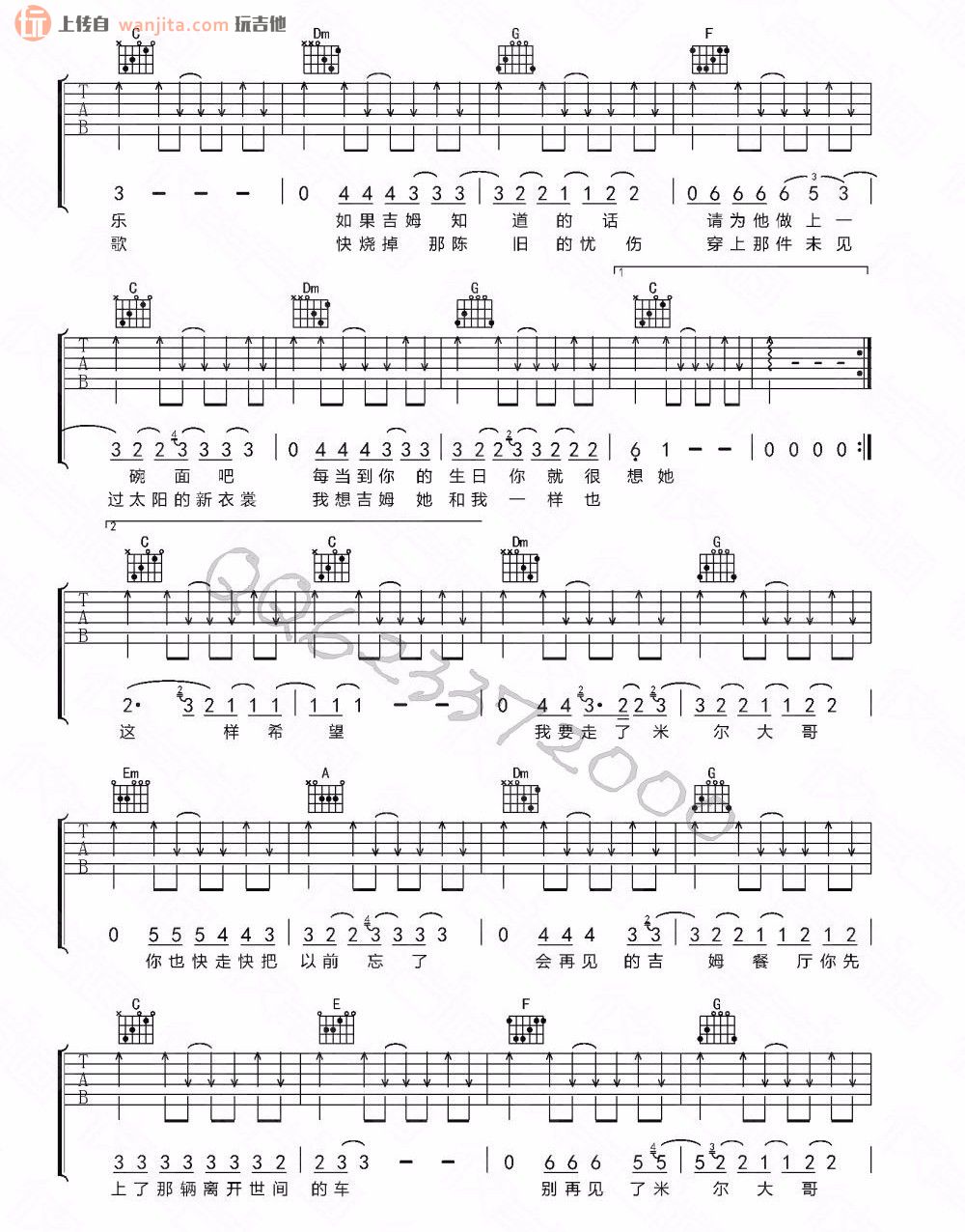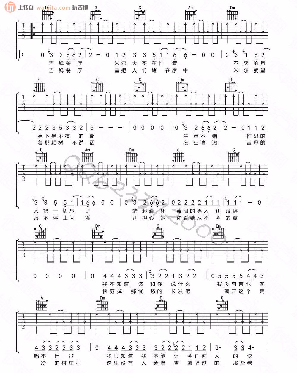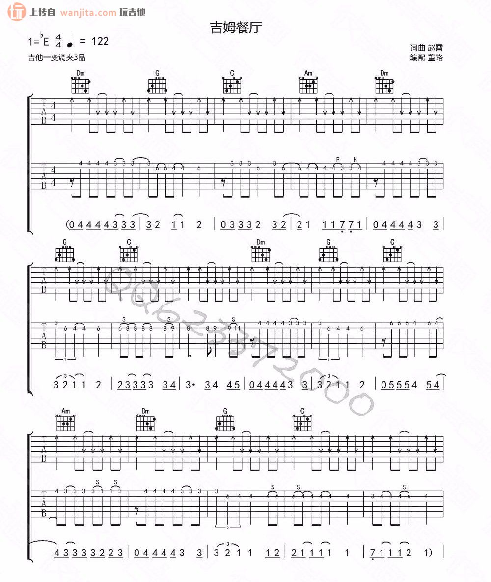 曲谱介绍: 《吉姆餐厅》吉他谱E调,变调夹夹3品。董路编配制谱。这首歌曲难度属于中等,适合进阶练习,大家在学习的时候要注意这首歌地间奏和前奏,多多练习。