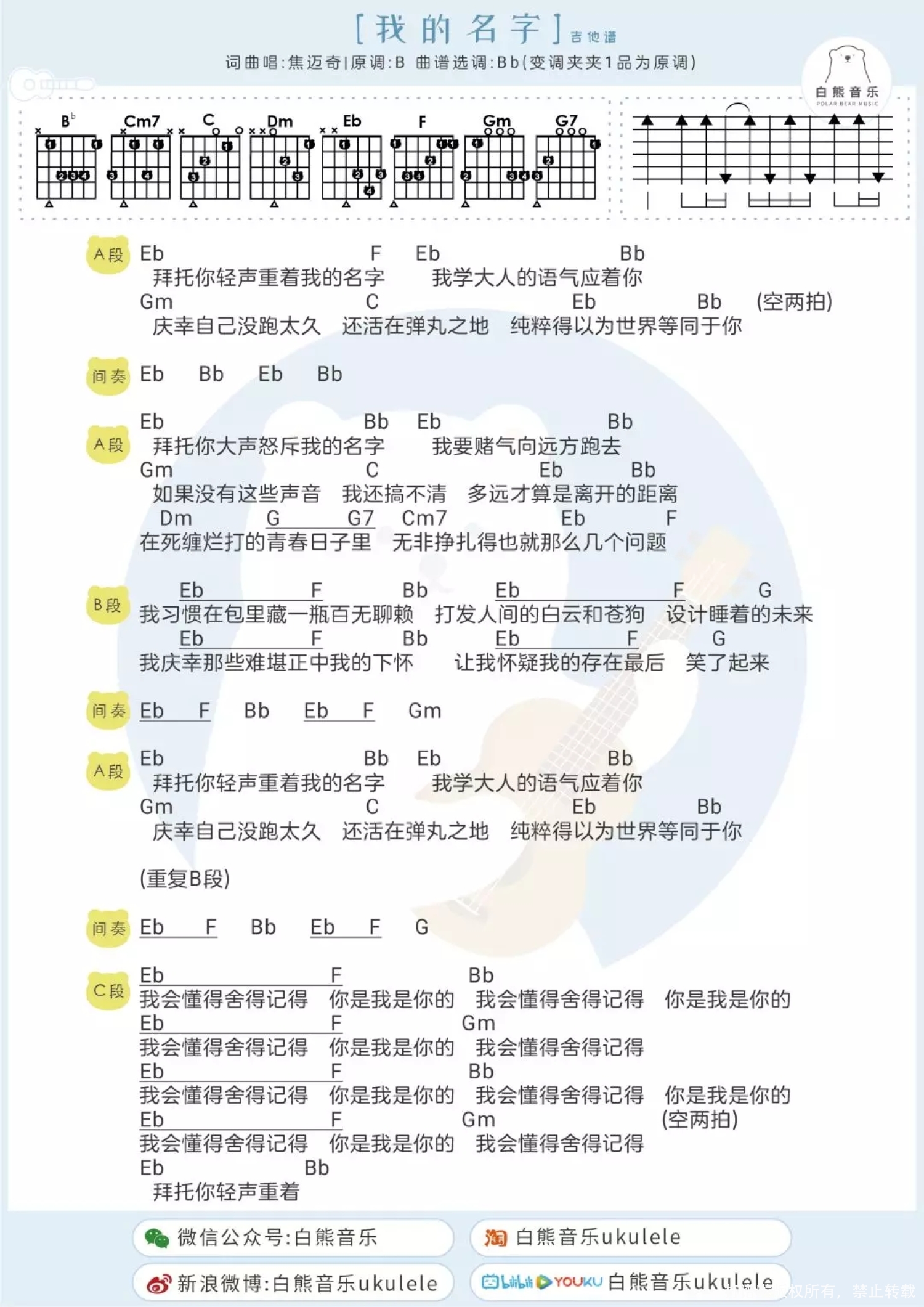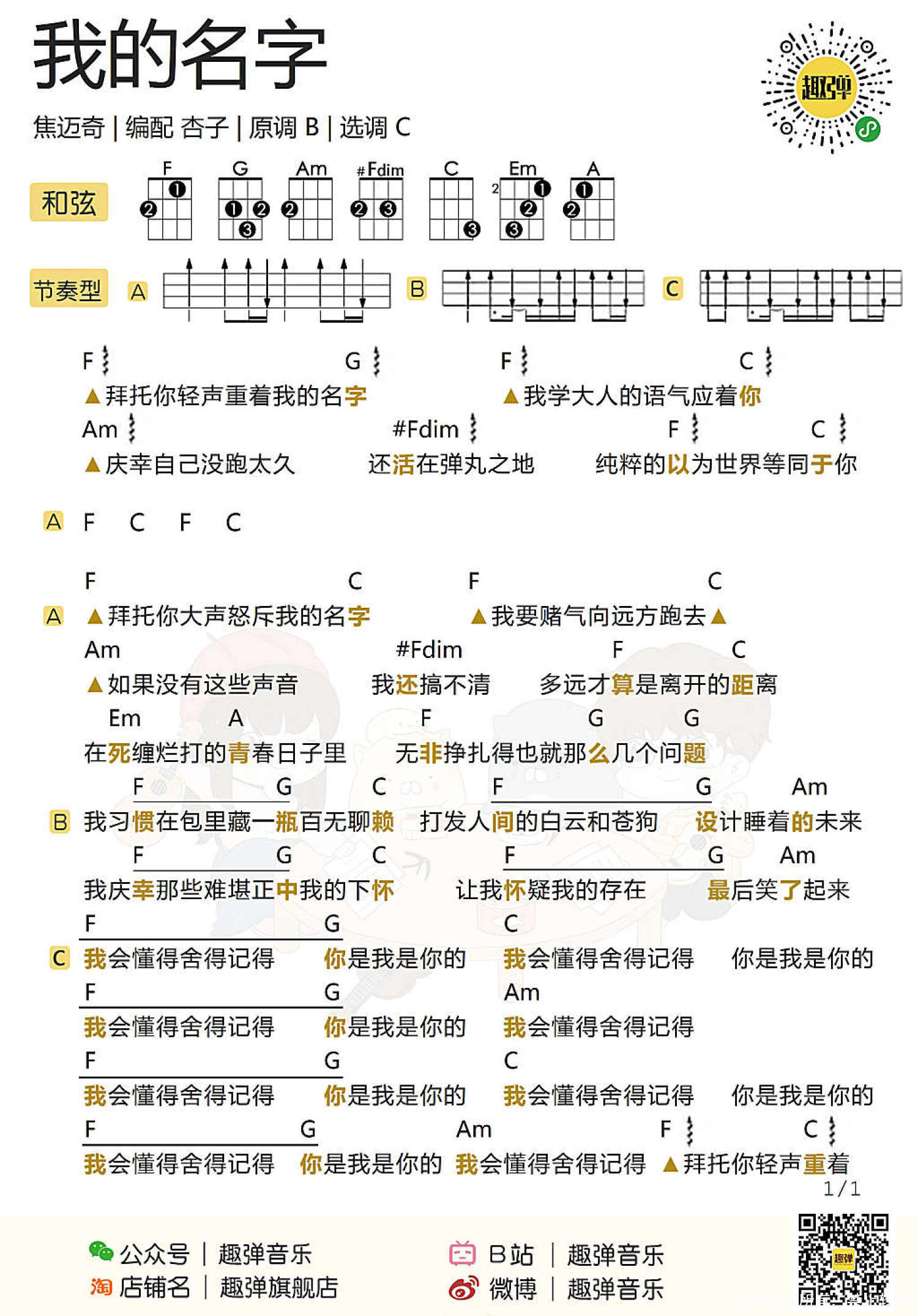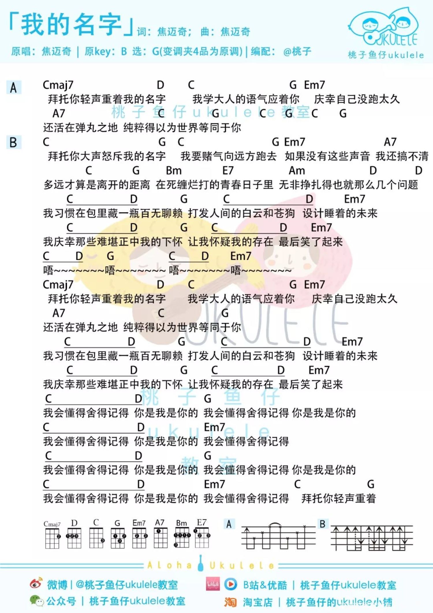 曲谱介绍: 我习惯在包里藏一瓶百无聊赖 打发人间的白云和苍狗 设计睡着的未来   Ukulele弹唱教学|@草帽呀   我的名字尤克里里弹唱谱 Bb调   我的名字尤克里里谱 G调   我的名字吉他谱   我的名字ukulele趣弹版   Aloha~ 今天杏子要教大家一首 非常温柔好听的歌儿~ 来自阳光大男孩焦迈奇的 《我的名字》 听着焦迈奇带着点慵懒的声线 像是沐浴在阳光下的温暖~   杏子丨弹唱教学