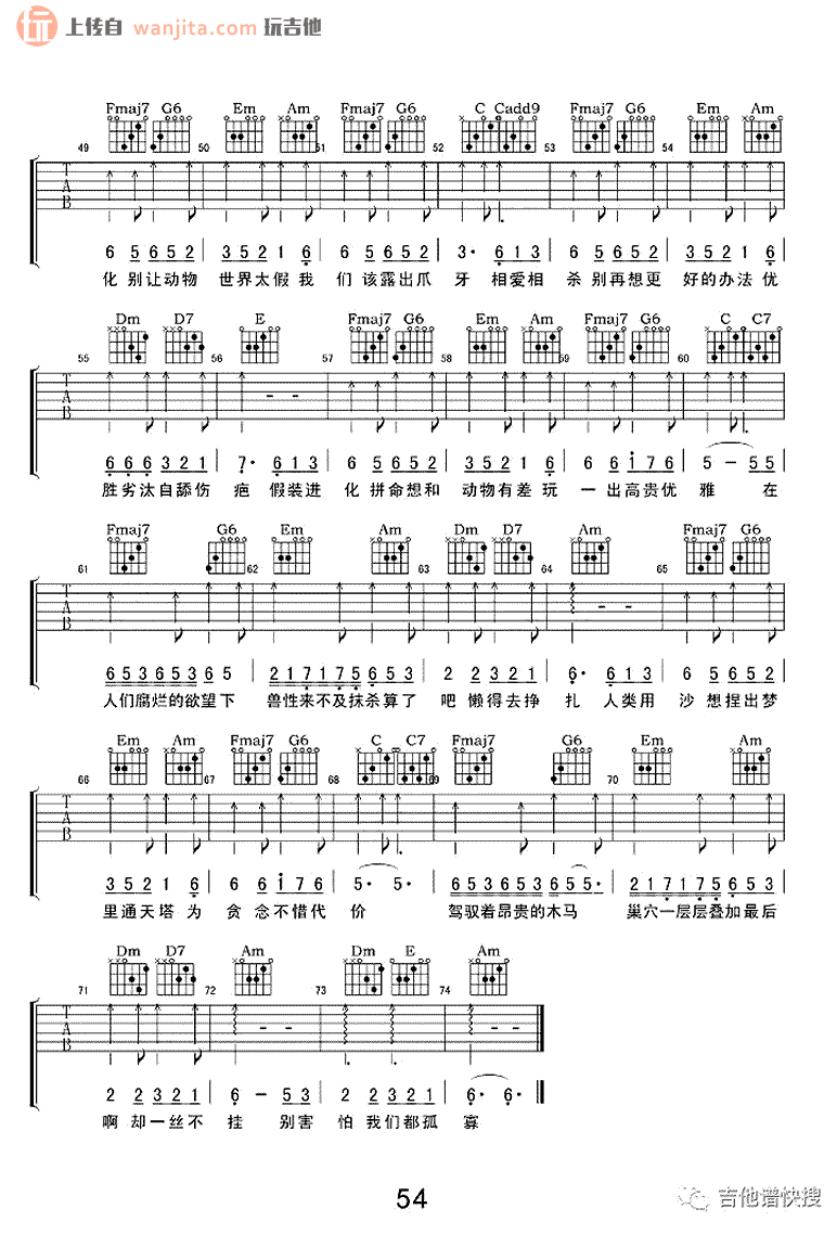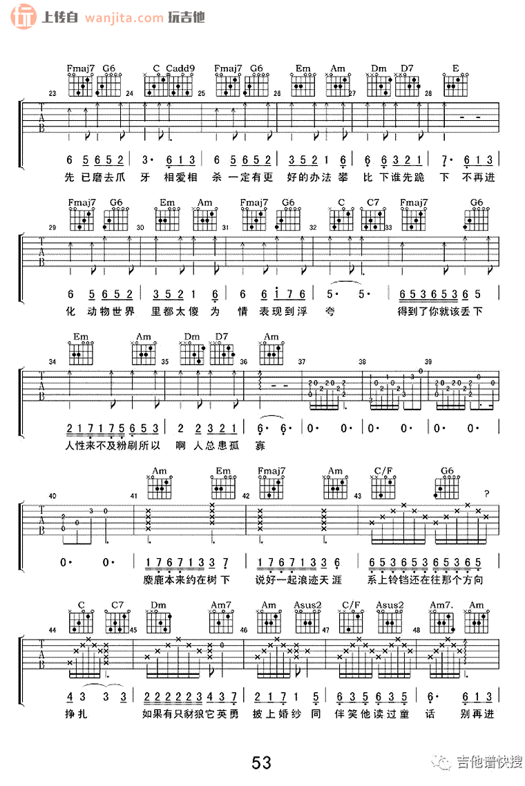 曲谱介绍: 《动物世界》吉他谱C调,不使用变调夹。这版曲谱作为男生调曲谱是比较简单的。但是不适合新手练习,这首歌曲的前奏还是有一点难度对于新手来说,节奏的转化也是比较多的,更适合进阶练习。