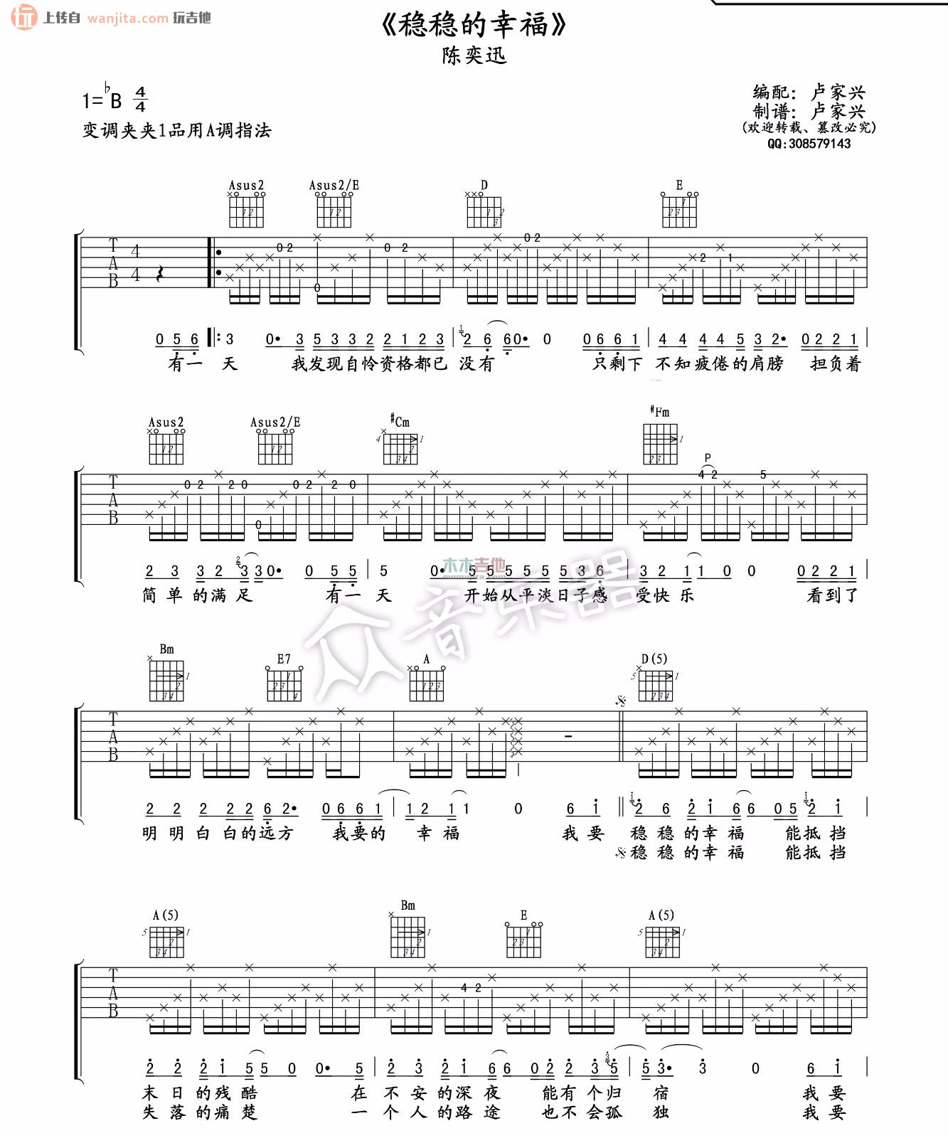曲谱介绍: 《稳稳的幸福》吉他谱B调,变调夹夹1品。使用A调指法。卢家兴制谱编配。这首稳稳的幸福曲谱比较简单,适合新手练习学习,大家学习的时候要注意这首歌曲的节奏。