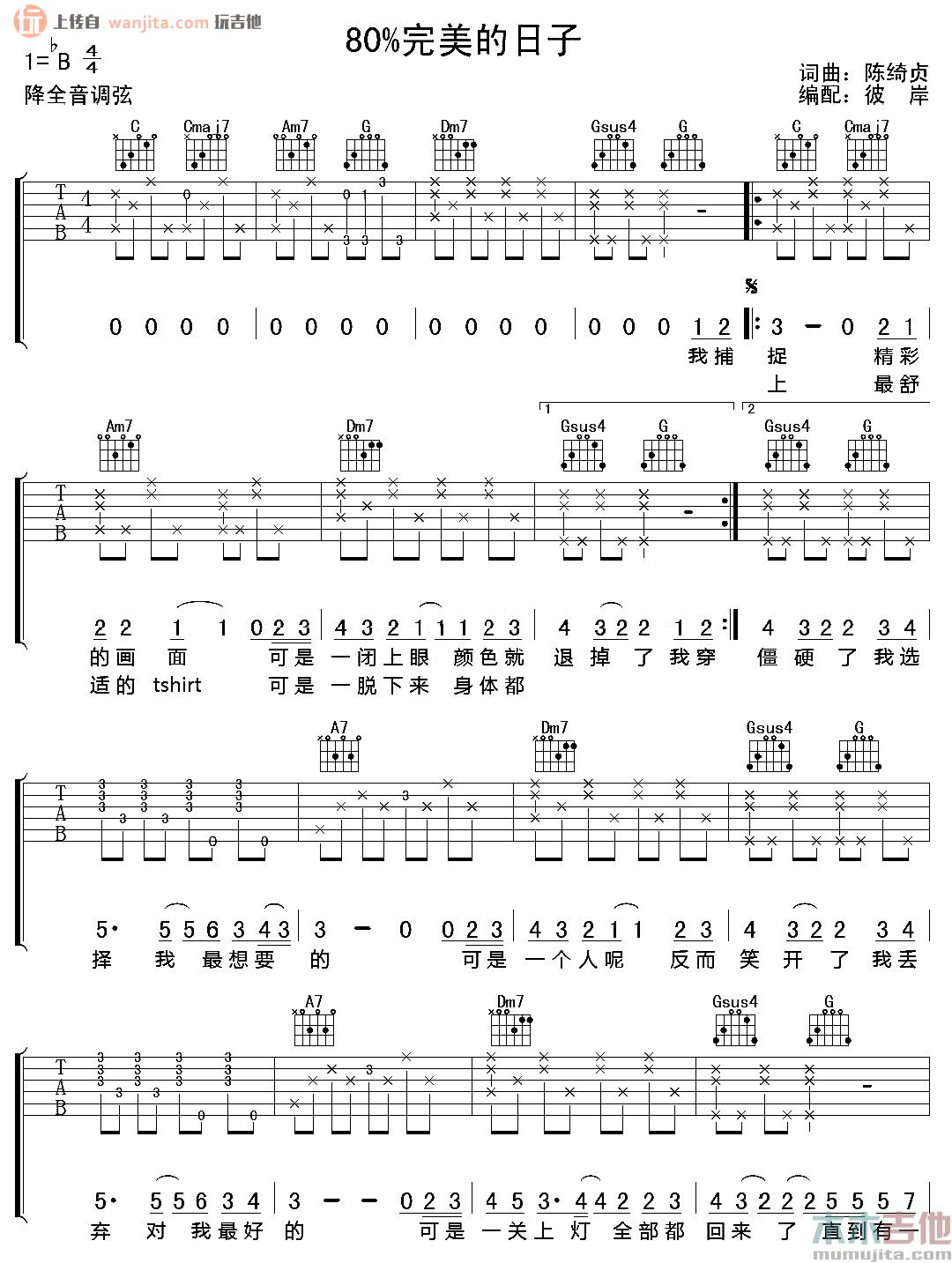 曲谱介绍: 《80%完美的日子》吉他谱B调,降半音调弦,不使用变调夹,彼岸编配制谱。这首歌曲难度属于中等,适合进阶练习,大家在学习的时候要注意这首歌地间奏和前奏,多多练习。