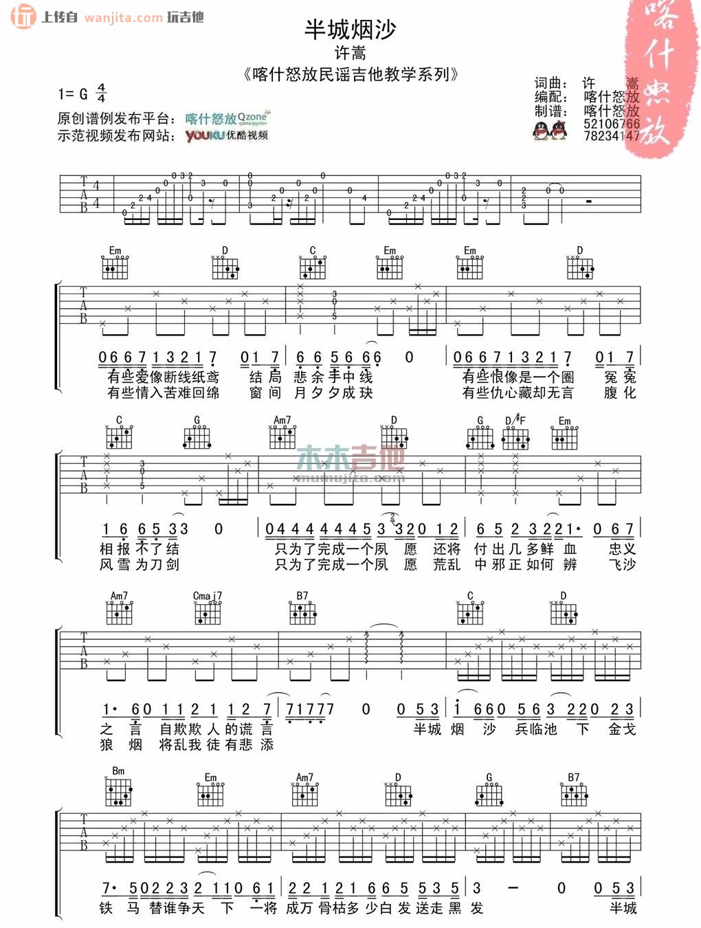 曲谱介绍: 《半城烟沙》吉他谱G调,不使用变调夹,喀什怒放编配制谱。这张谱子比较简单,适合新手练习学习。但是要多多注意前奏和间奏对歌曲情绪的影响变化。朋友们喜欢的记得收藏喔!