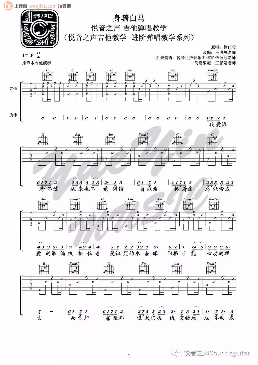 曲谱介绍: 《身骑白马》吉他谱F调,原生木吉他演奏,不使用变调夹,王博思改编。歌曲整体不算难,这首歌主要表达的是情感,所以吉他能很好地搭配这首歌,很适合吉他弹唱的一首流行音乐。 《身骑白马》吉他弹唱教学视频