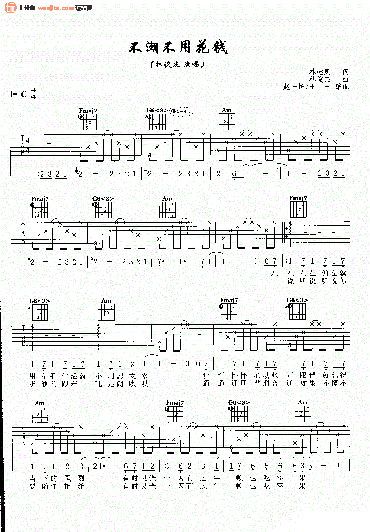 曲谱介绍: 林俊杰《不潮不用花钱》吉他弹唱谱,采用C调指法编配,共有3张高清图谱。
