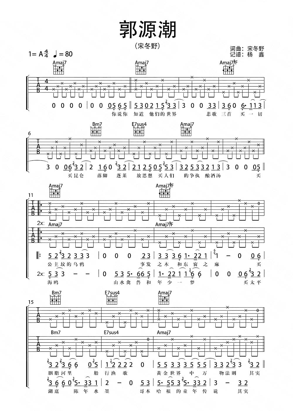 郭源潮吉他谱 - 宋冬野 - A调吉他弹唱谱 - 原版
