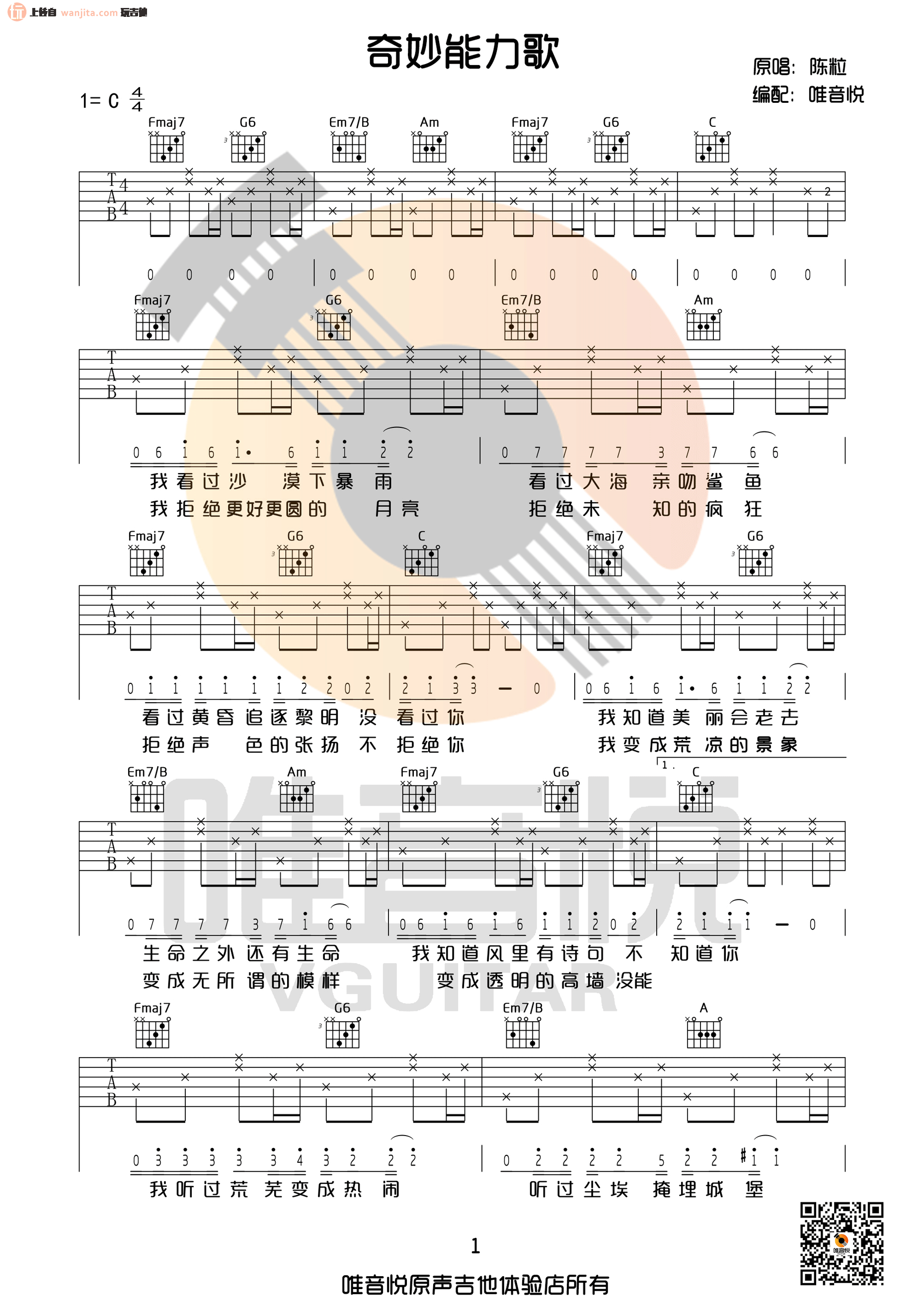 曲谱介绍: 《奇妙能力歌》吉他谱C调,不使用变调夹,唯音乐编配。好听的节奏和副歌部分注定了这首简单的民谣会走得很远。总体来说,这张吉他谱对于新手来说十分友好。很适合作为一首练习曲在初期学习当中弹唱。