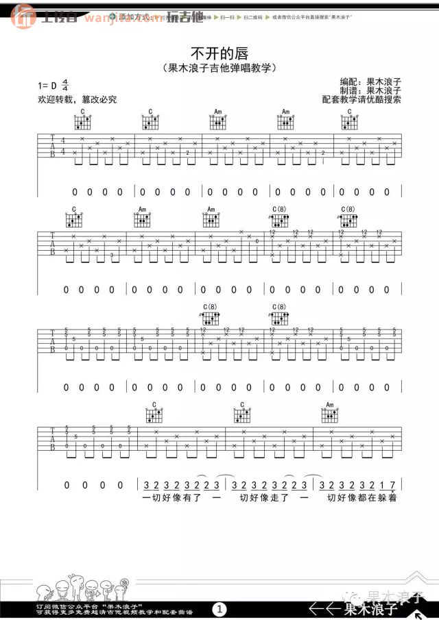 曲谱介绍: 《不开的唇》吉他谱,原调D调,不使用变调,果木浪子编配制谱。整首歌曲谱曲不算难,适合新手学习练习。但是,大家在练习的时候要注意歌曲的情绪起伏,一首好听的民谣歌曲记得收藏。 《不开的唇》吉他弹唱教学视频