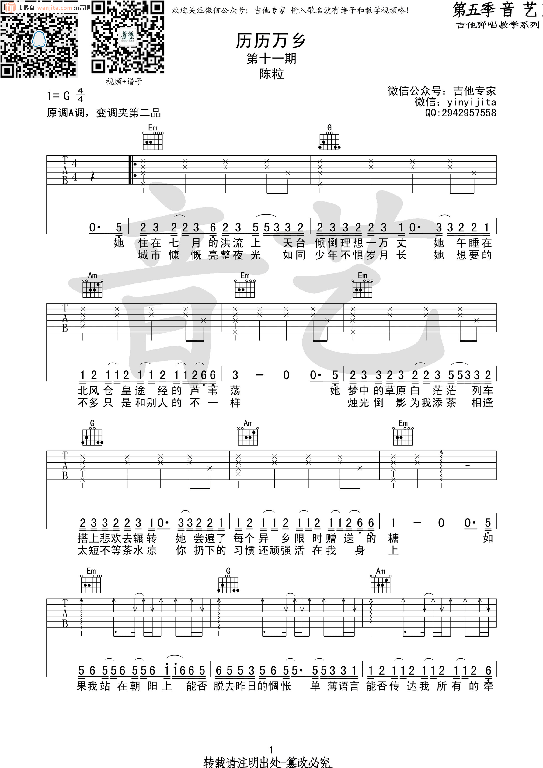 曲谱介绍: 《历历万乡》吉他谱,原调A调,选用G调,变调夹夹二品。这张谱子比较简单,适合新手练习学习。但是要多多注意前奏和间奏对歌曲情绪的影响变化。一首值得学习的民谣。喜欢的朋友们记得收藏喔!