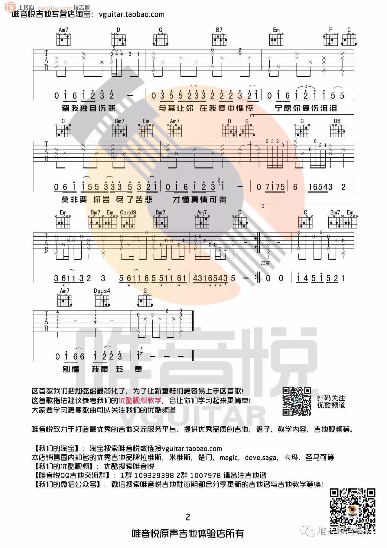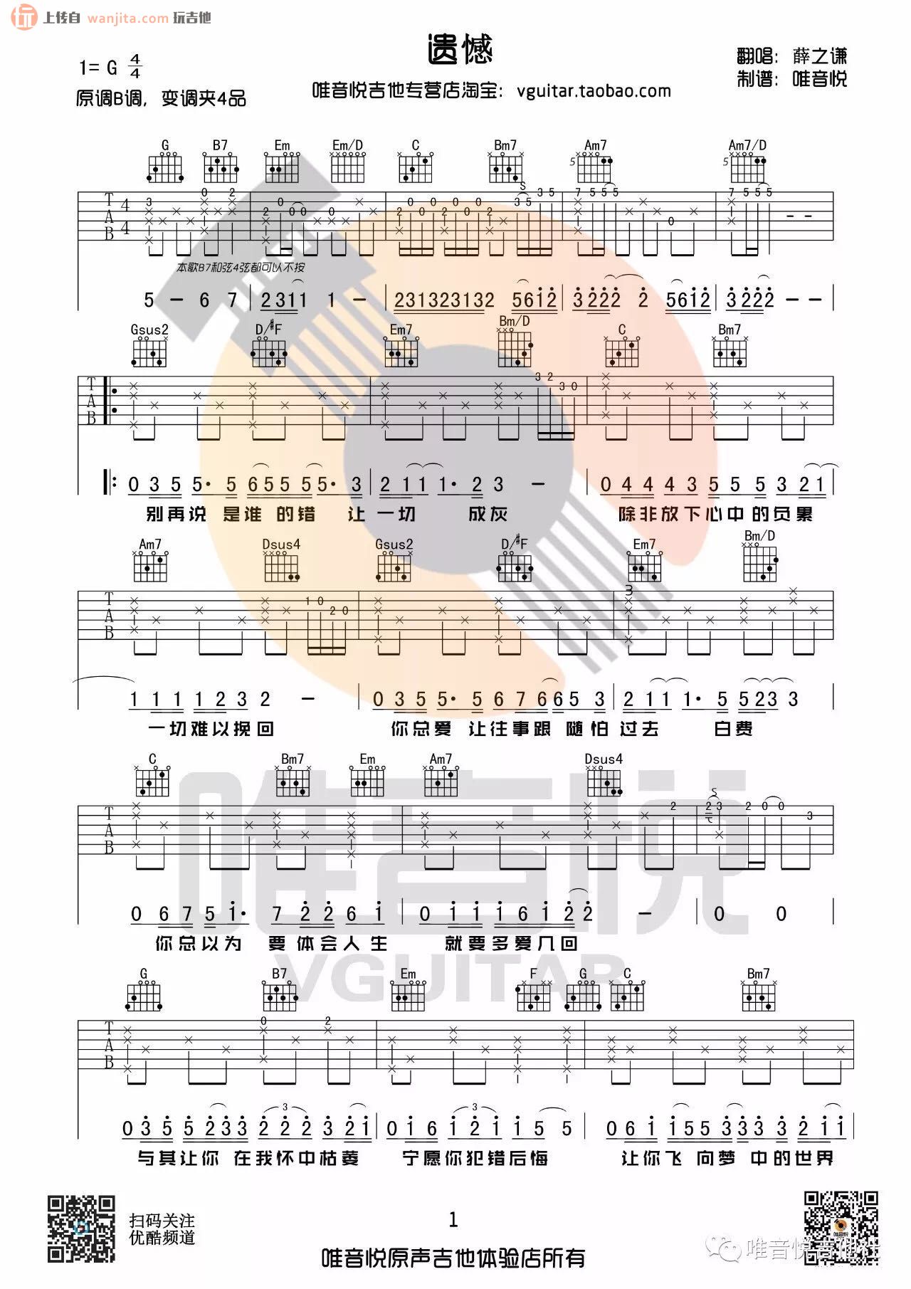 曲谱介绍: 薛之谦《遗憾》吉他弹唱谱,共有2张高清图谱,免翻页排版设计。