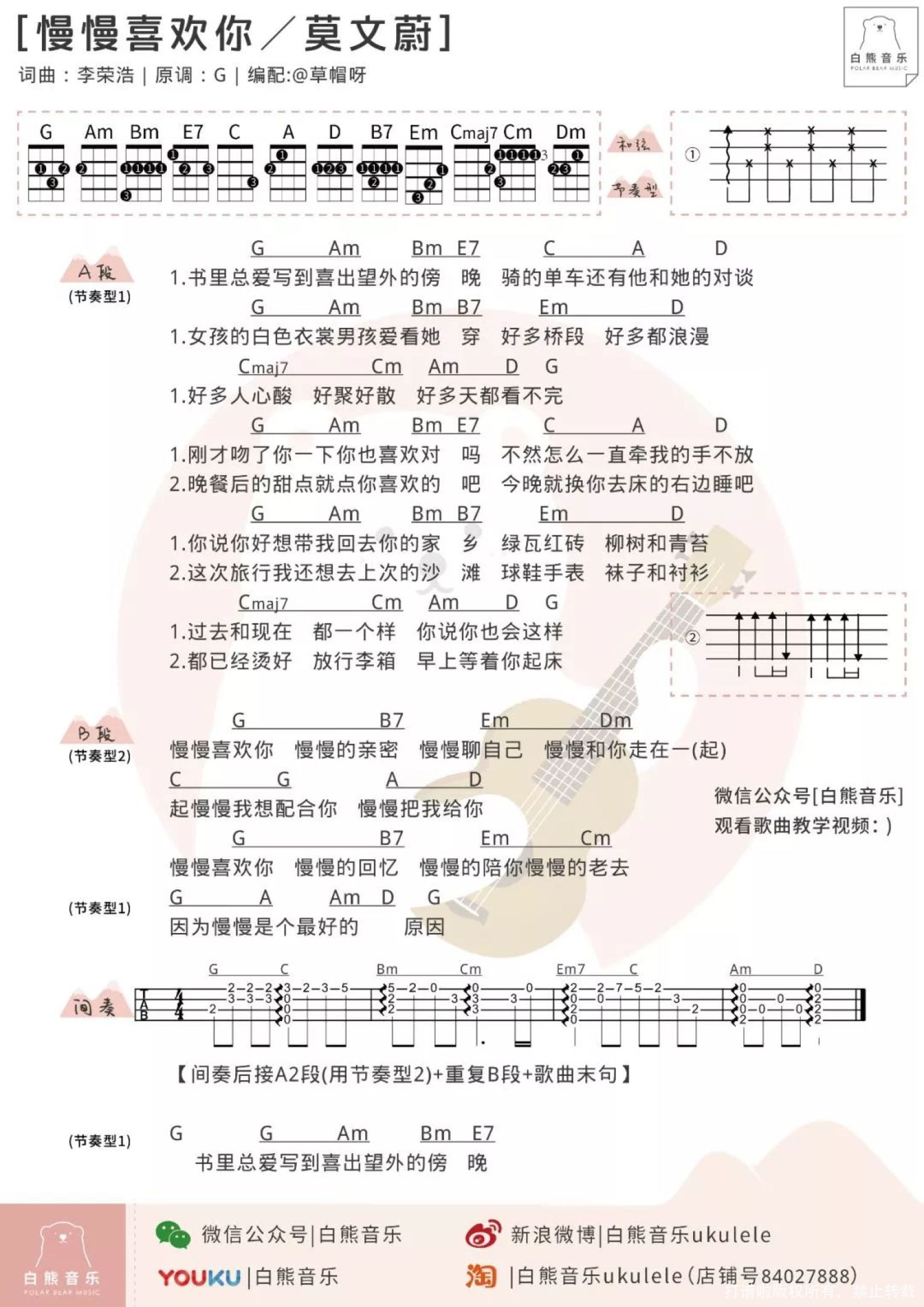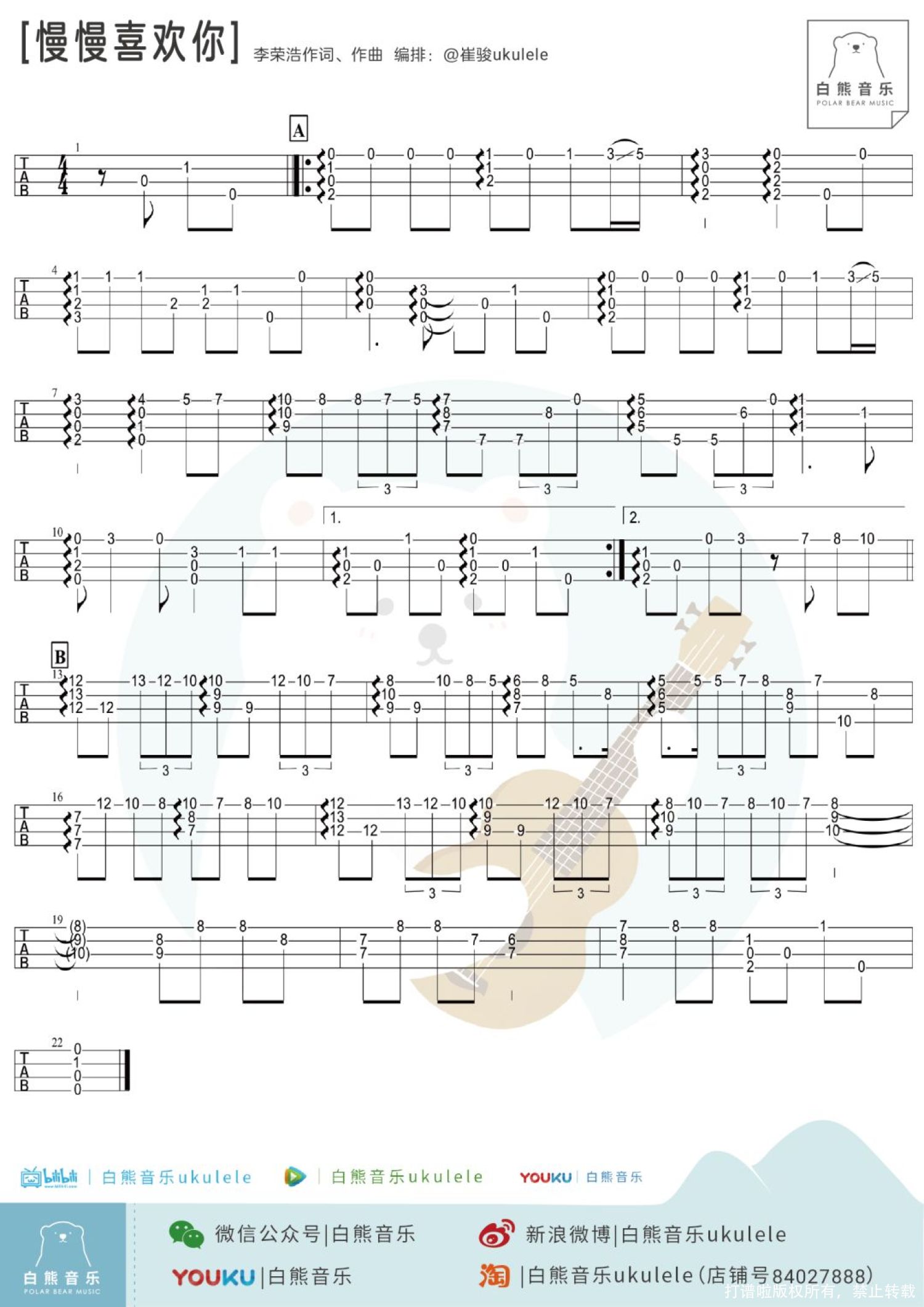 曲谱介绍: "慢慢喜欢你 慢慢和你走在一起 慢慢的陪你慢慢的老去"   Ukulele指弹|@崔骏ukulele   Ukulele弹唱教学|@草帽呀   指弹教学|@崔骏ukulele   尤克里里谱 1、指弹谱   2、弹唱谱