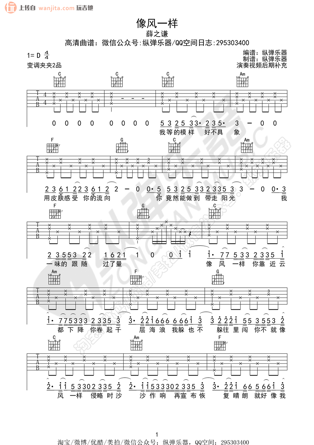 像风一样吉他谱 - 薛之谦 - D调吉他弹唱谱 - 原版