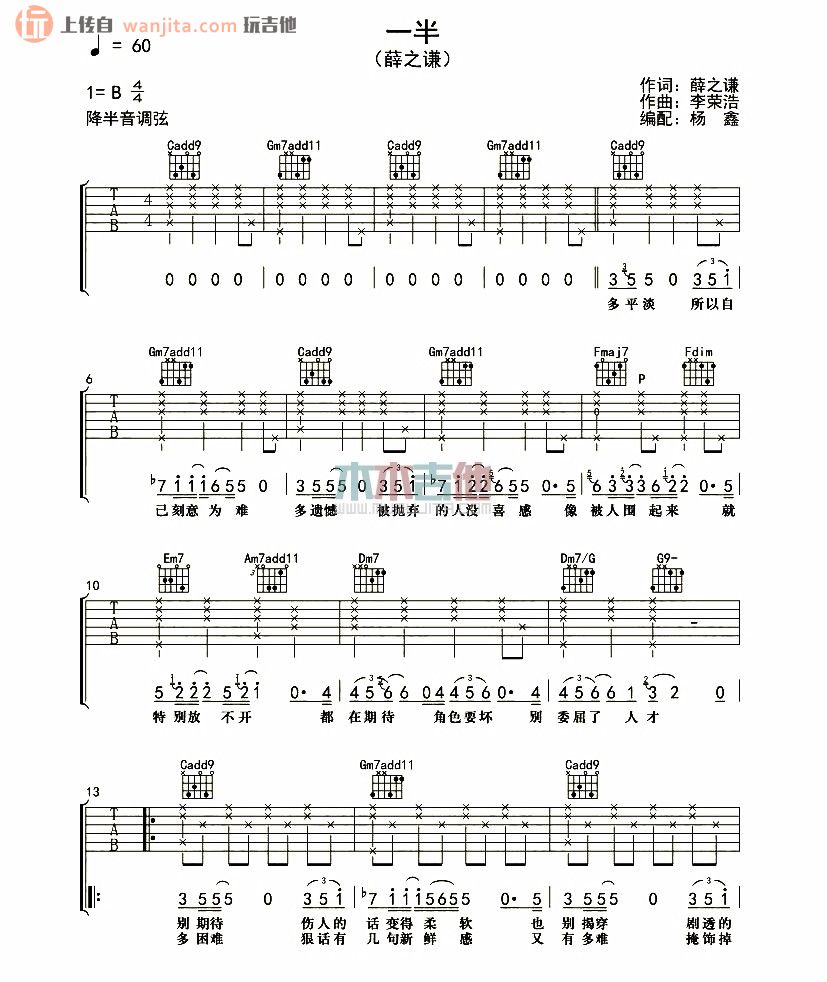 一半吉他谱 - 薛之谦 - B调吉他弹唱谱