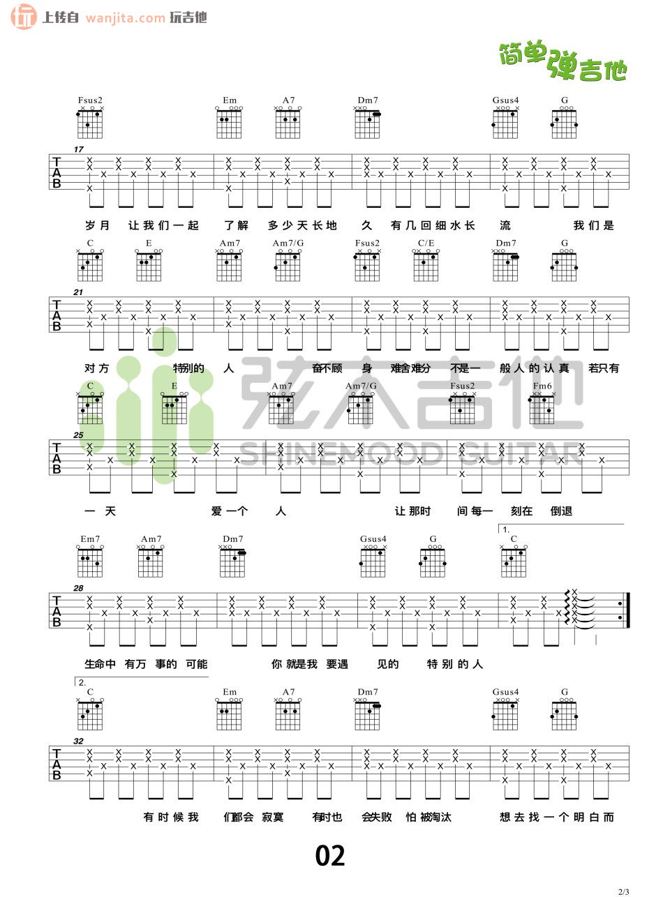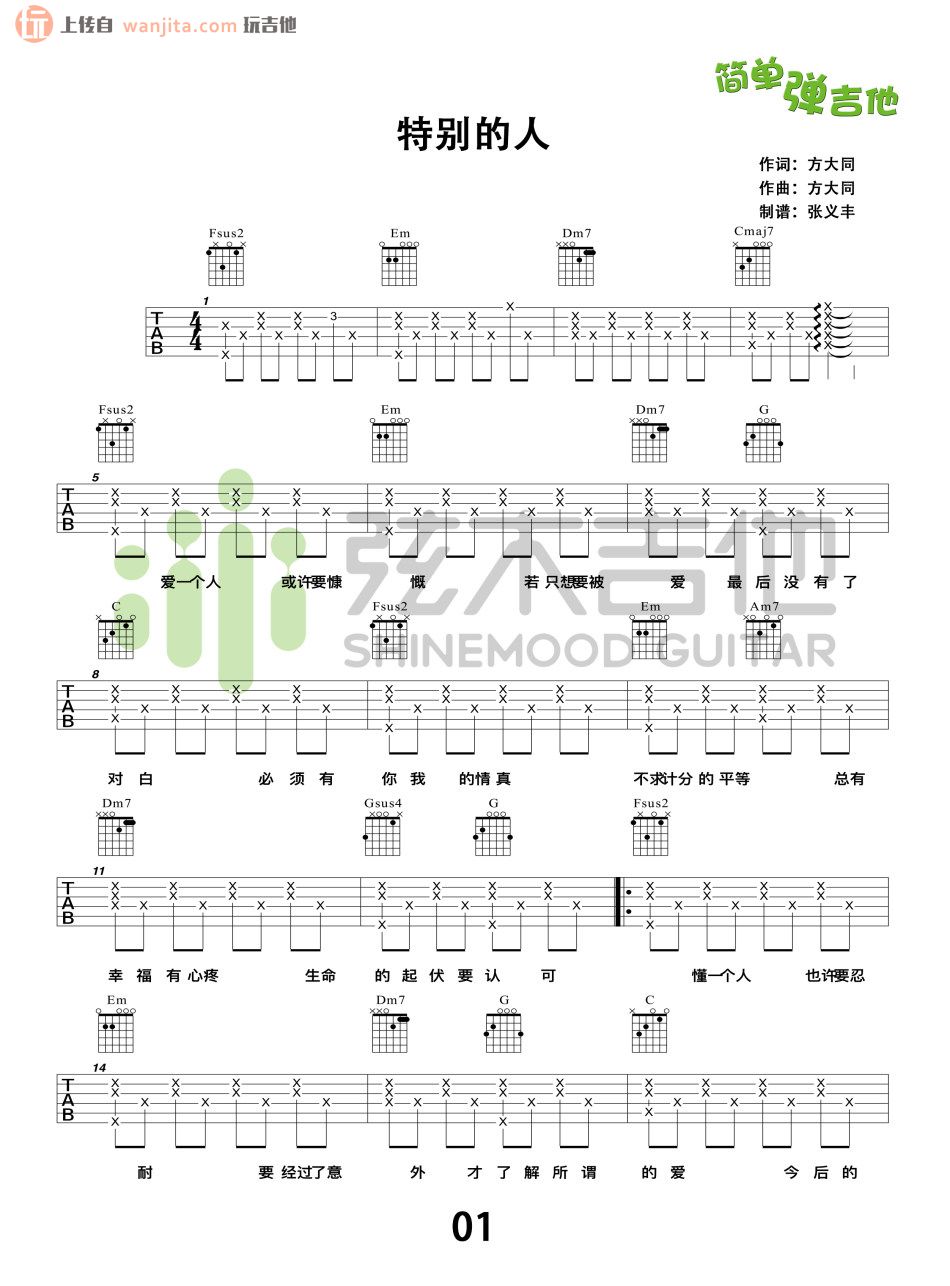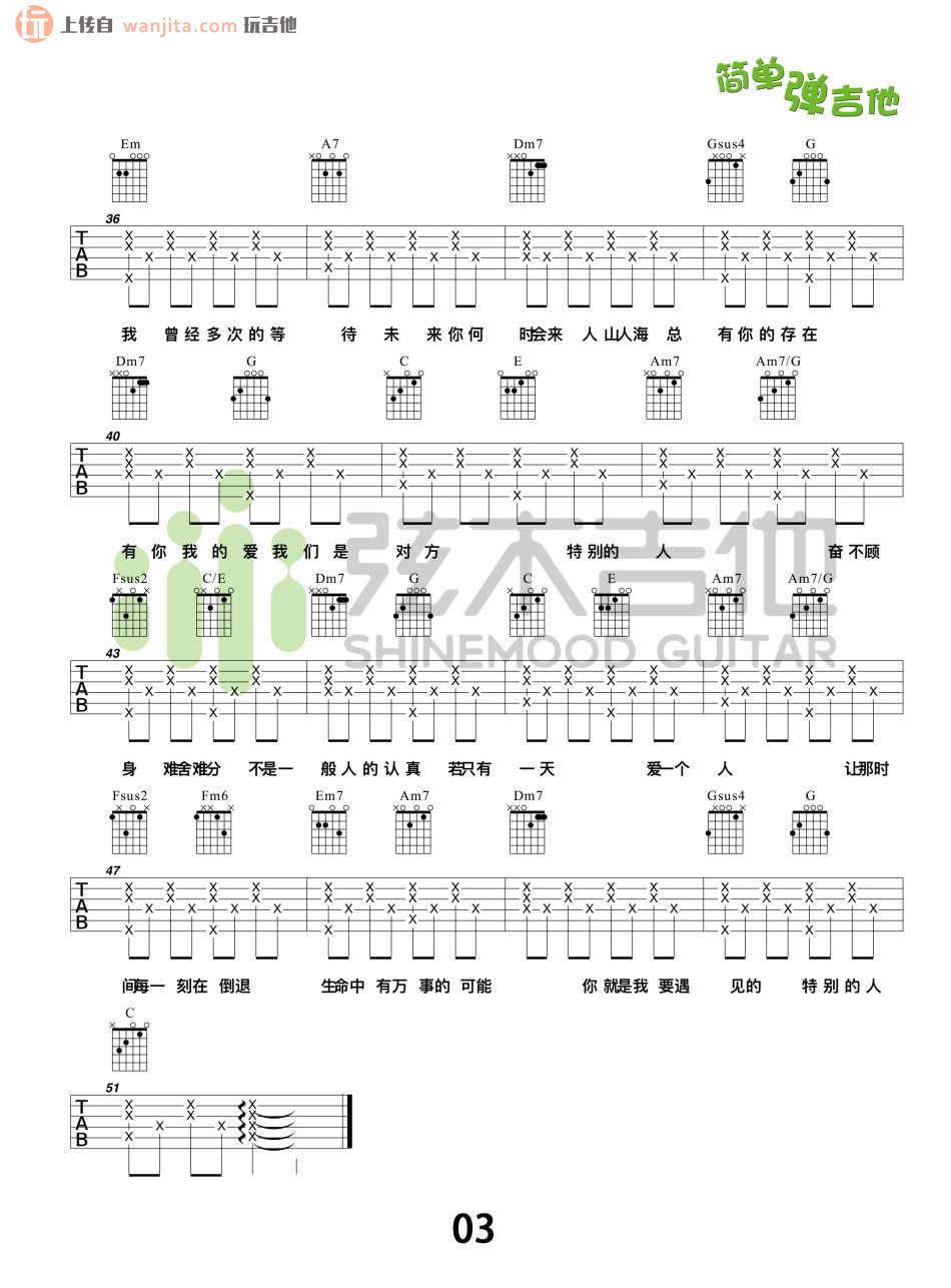 曲谱介绍: 方大同《特别的人》吉他弹唱谱,共有3张高清图谱。