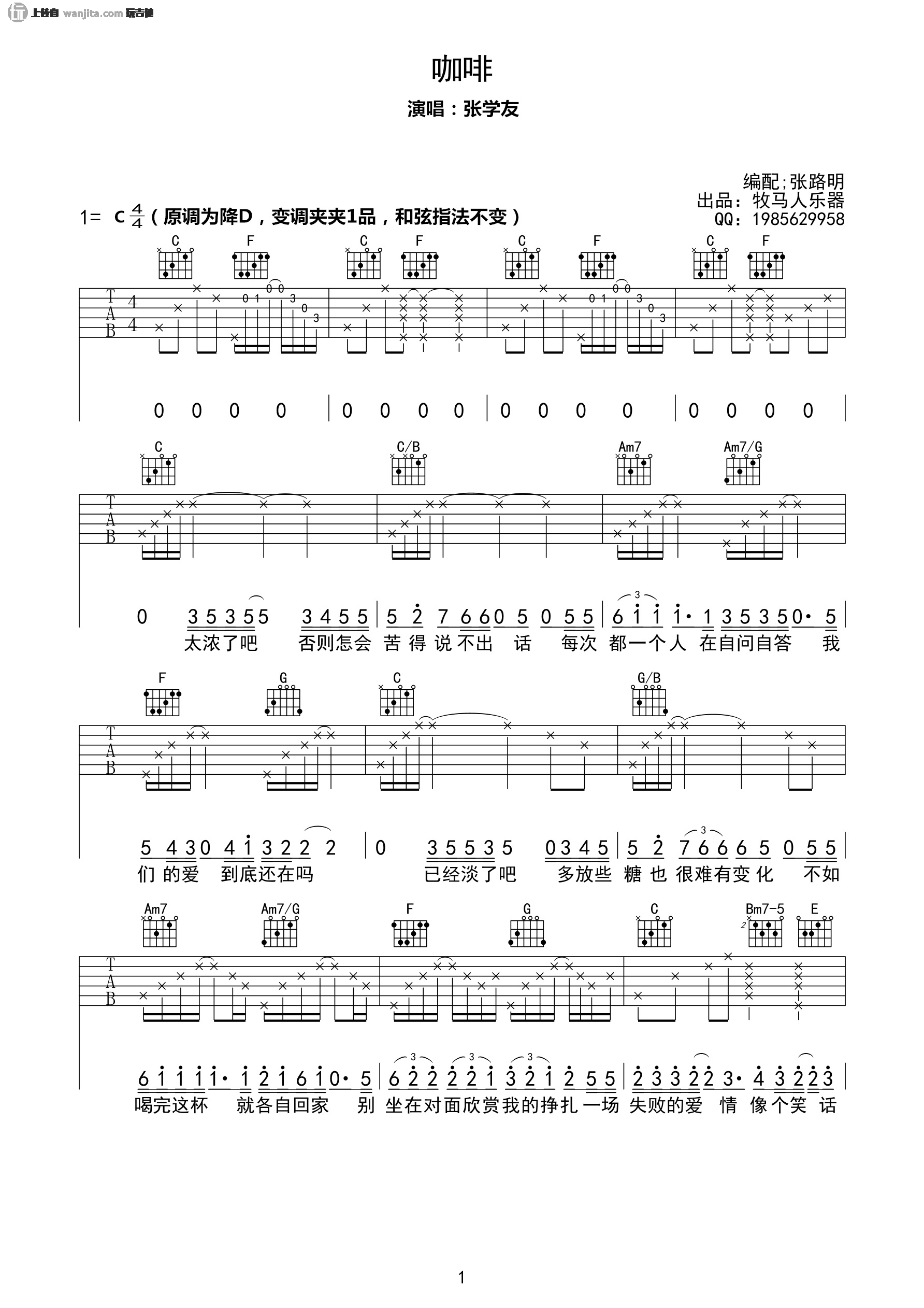 曲谱介绍: 《咖啡》吉他谱,原调降D,选用C调,变调夹夹1品,和弦指法不变。整首歌曲谱曲不算难,适合新手学习练习。但是,大家在练习的时候要注意前奏的节奏感,一首经典的歌曲记得收藏。