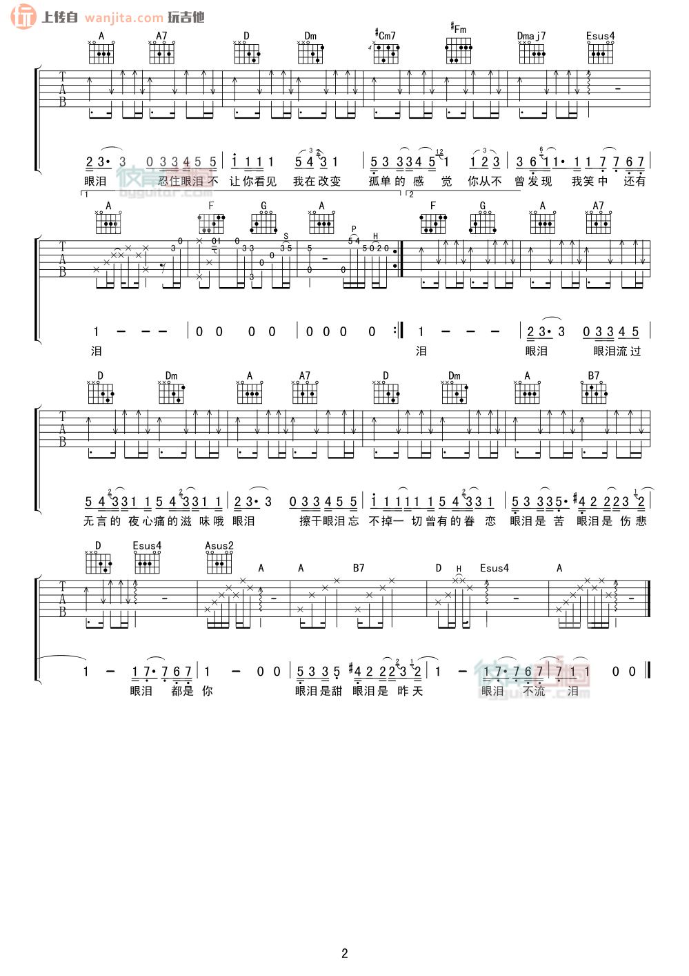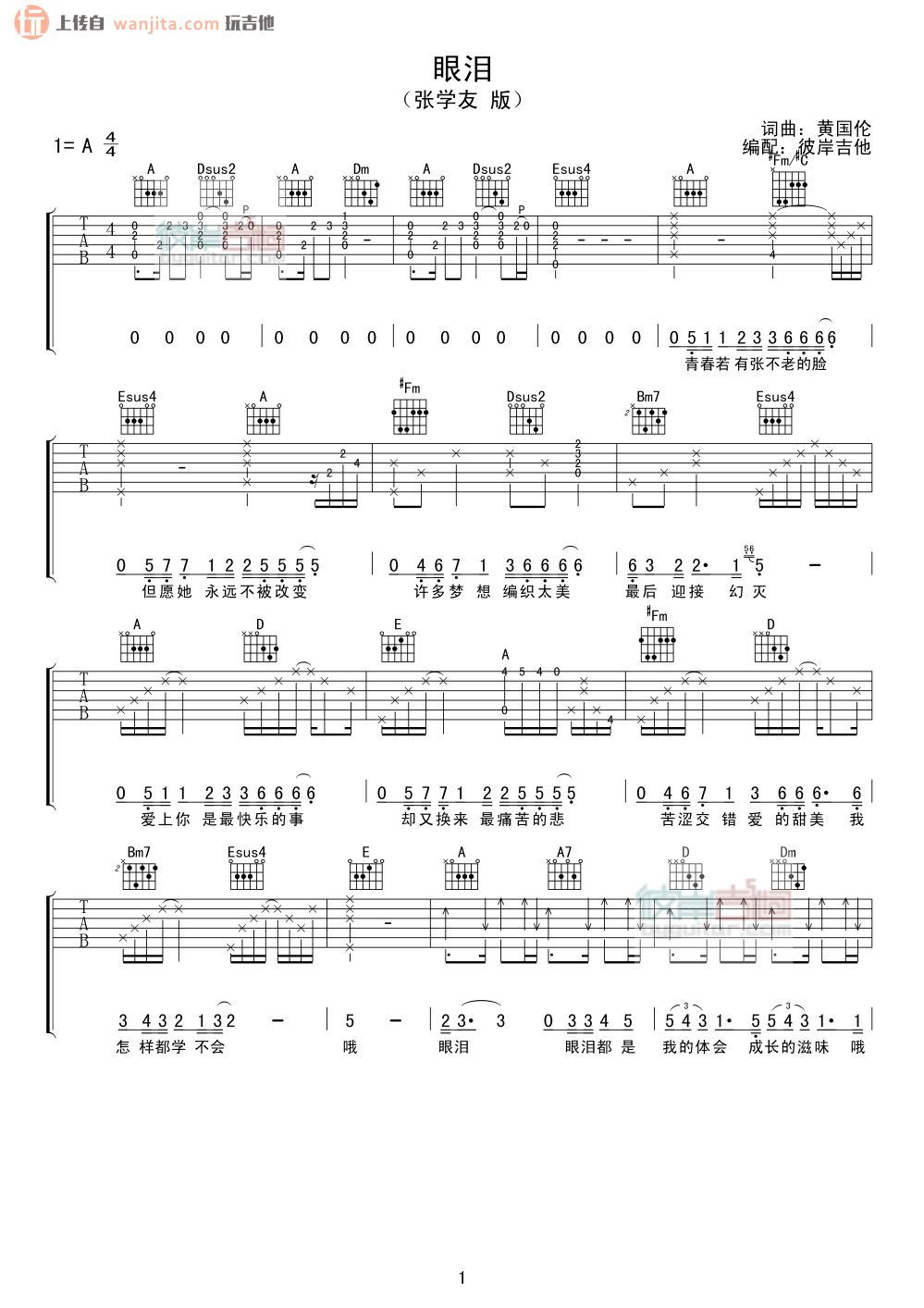 曲谱介绍: 张学友《眼泪》吉他弹唱谱,采用A调指法编配,共有2张高清图谱,免翻页排版设计。
