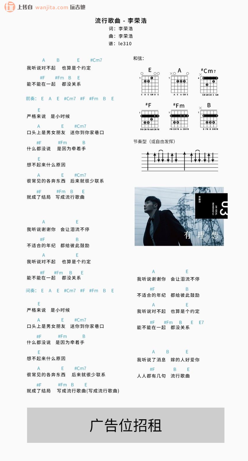曲谱介绍: 李荣浩《流行歌曲》吉他弹唱谱,共有1张高清图谱,免翻页排版设计。