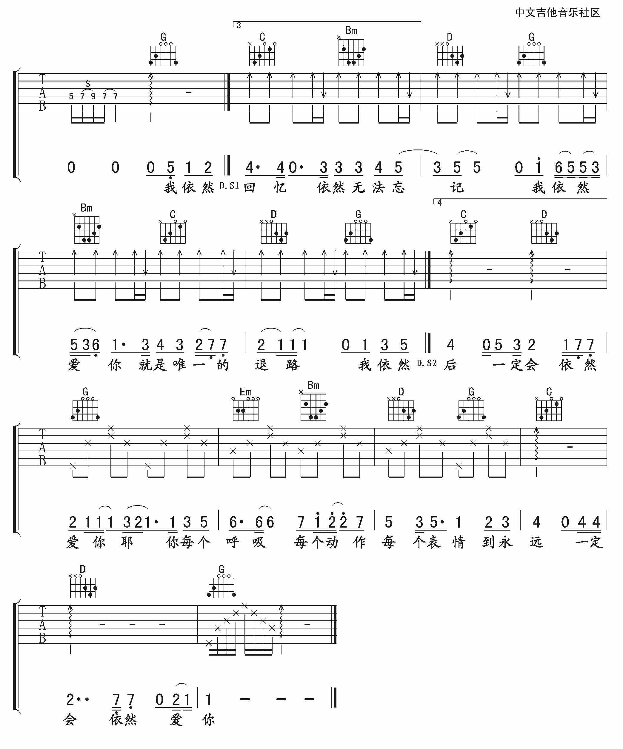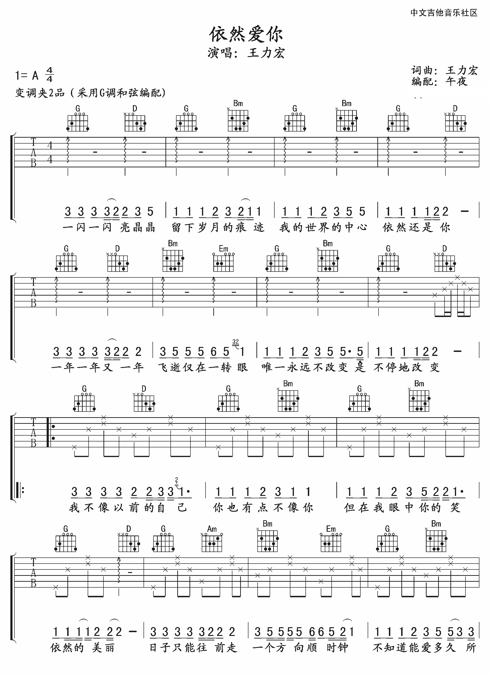 曲谱介绍: 王力宏《依然爱你》吉他弹唱谱,采用G调指法编配,共有3张高清图谱。