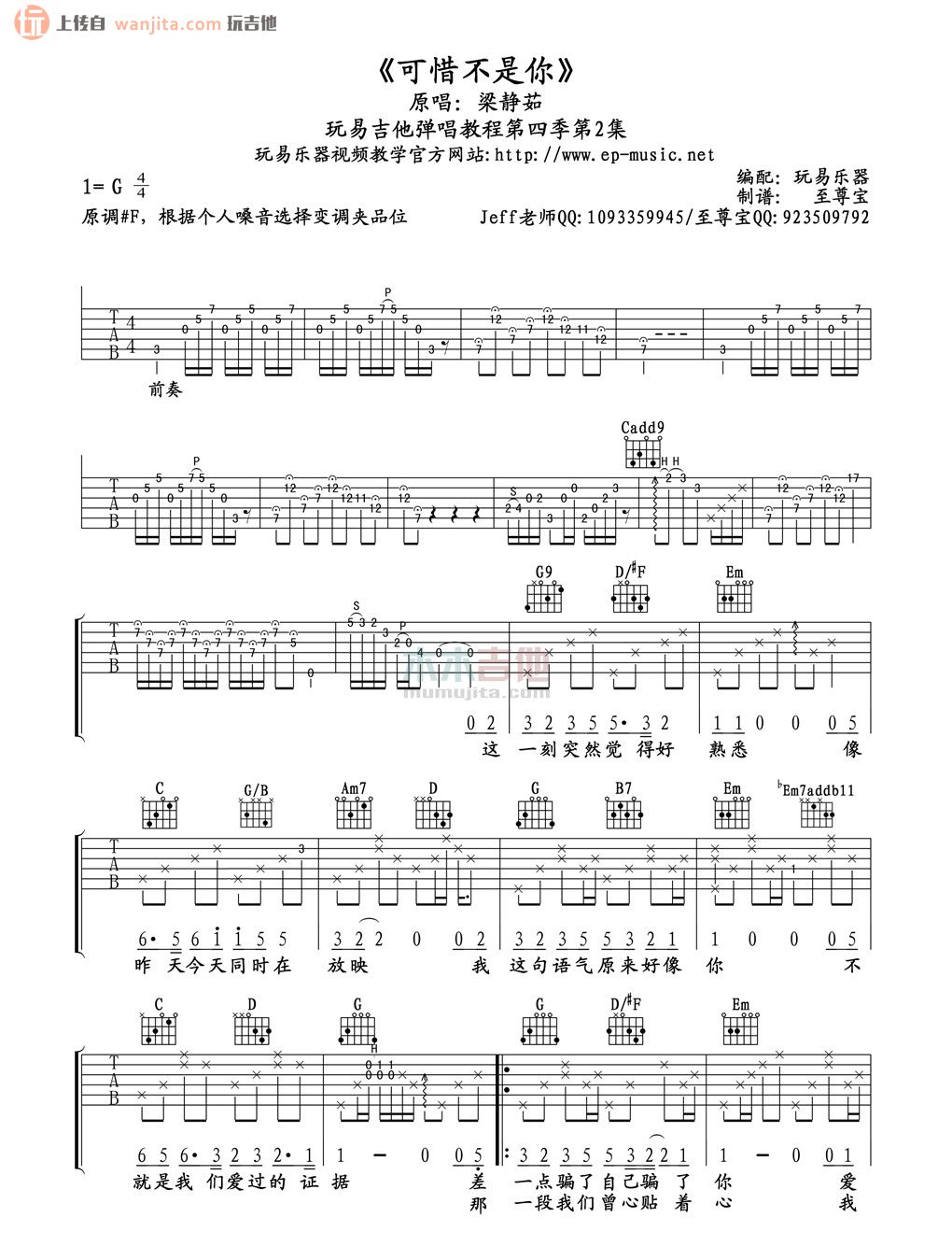 曲谱介绍: 《可惜不是你》吉他谱,使用G调,根据个人嗓音选择变调夹品位,玩易乐器编配。这首歌曲难度属于中等,适合进阶练习,大家在学习的时候要注意这首歌地前奏,值得学习的一首歌曲。