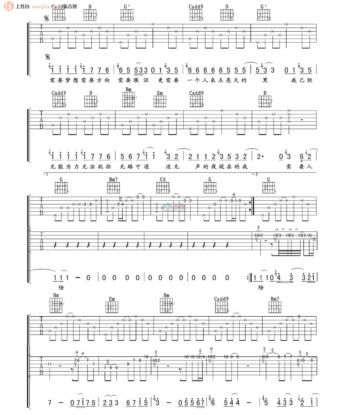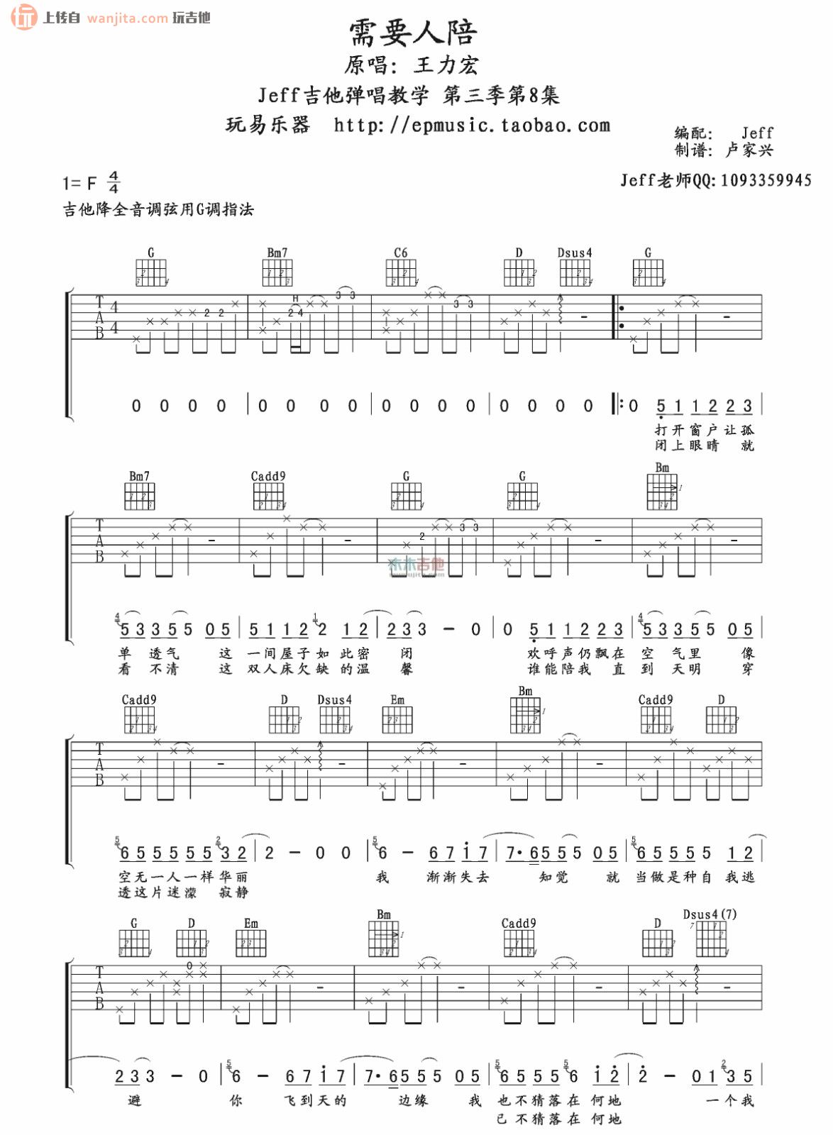 曲谱介绍: 《需要人陪》吉他谱,F调,降全音调弦用G调指法。卢家兴制谱。这张谱子比较简单,适合新手练习学习。但是要多多注意前奏和间奏对歌曲情绪的影响变化。一首适合深夜唱给自己的歌。