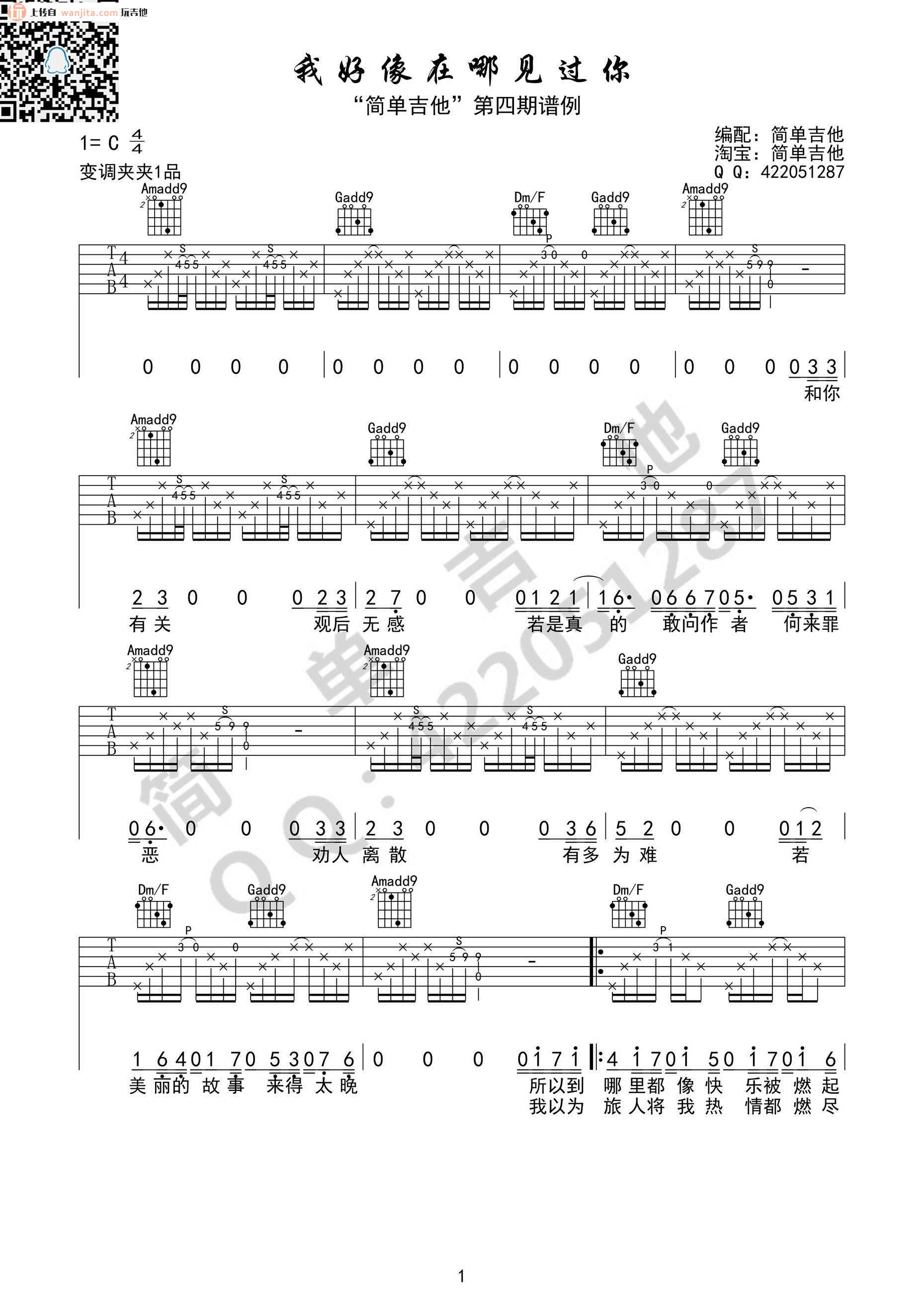 曲谱介绍: 《我好像在哪见过你》吉他谱,C调,变调夹夹1品。前奏比较复杂,但十分好听,值得学习弹唱。最精彩也就是这首歌的扫弦,丰富的层次感和节奏感带给人不一般的吉他弹唱享受。不论你是新手白鸟还是老油条,你都会喜欢上这个吉他谱。