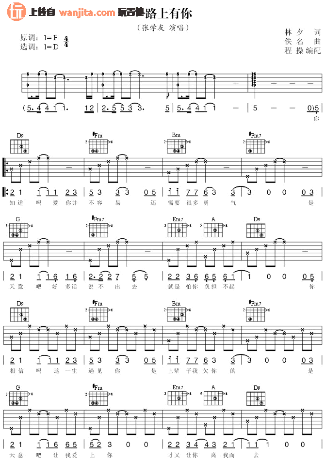 曲谱介绍: 《一路上有你》吉他谱,使用D调,不使用变调夹。程操编配。歌曲整体不算难,这首歌主要表达的是情感,所以吉他能很好地搭配这首歌,很适合吉他弹唱的一首流行音乐。