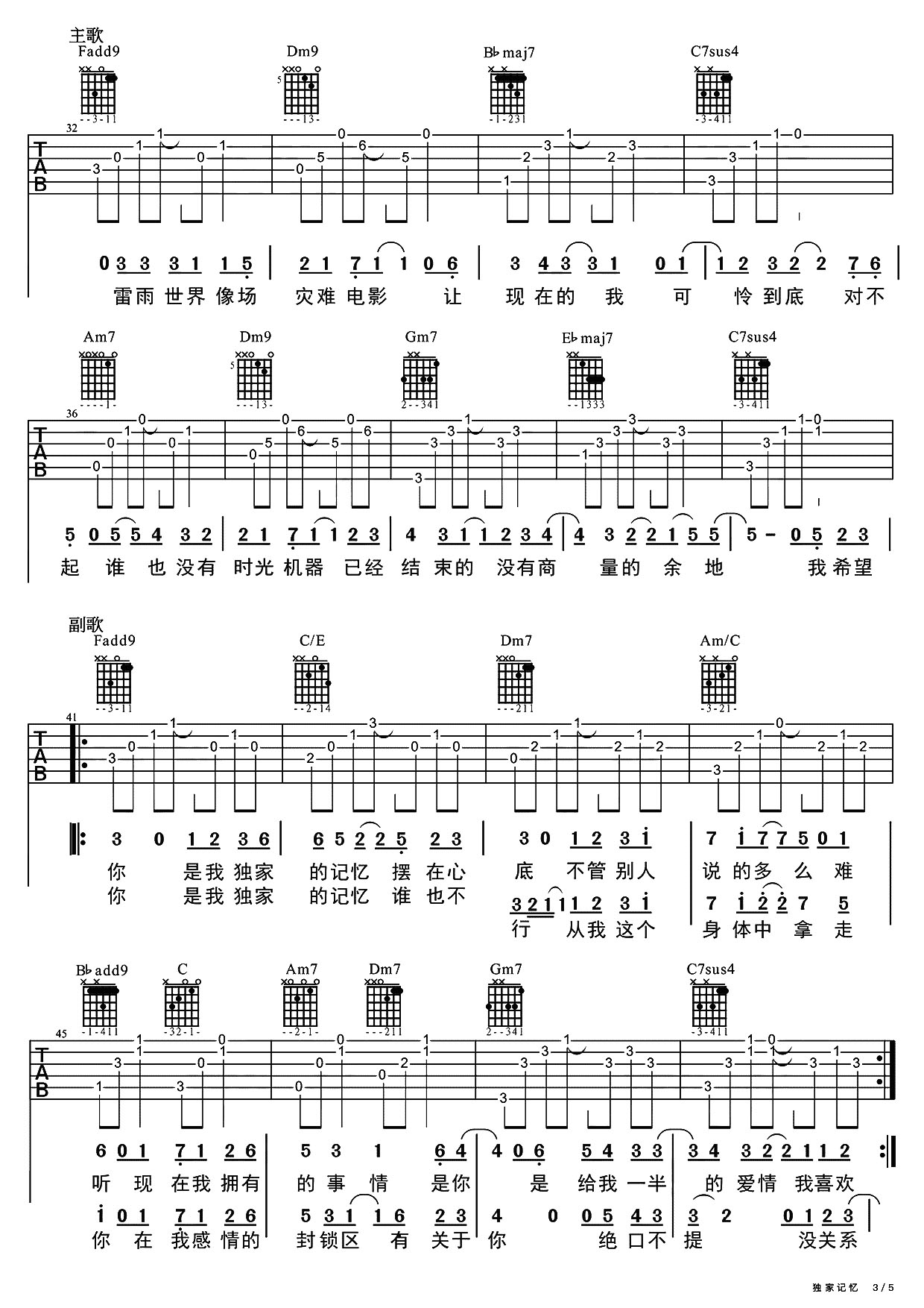 曲谱介绍: 《独家记忆》吉他弹唱教学示范