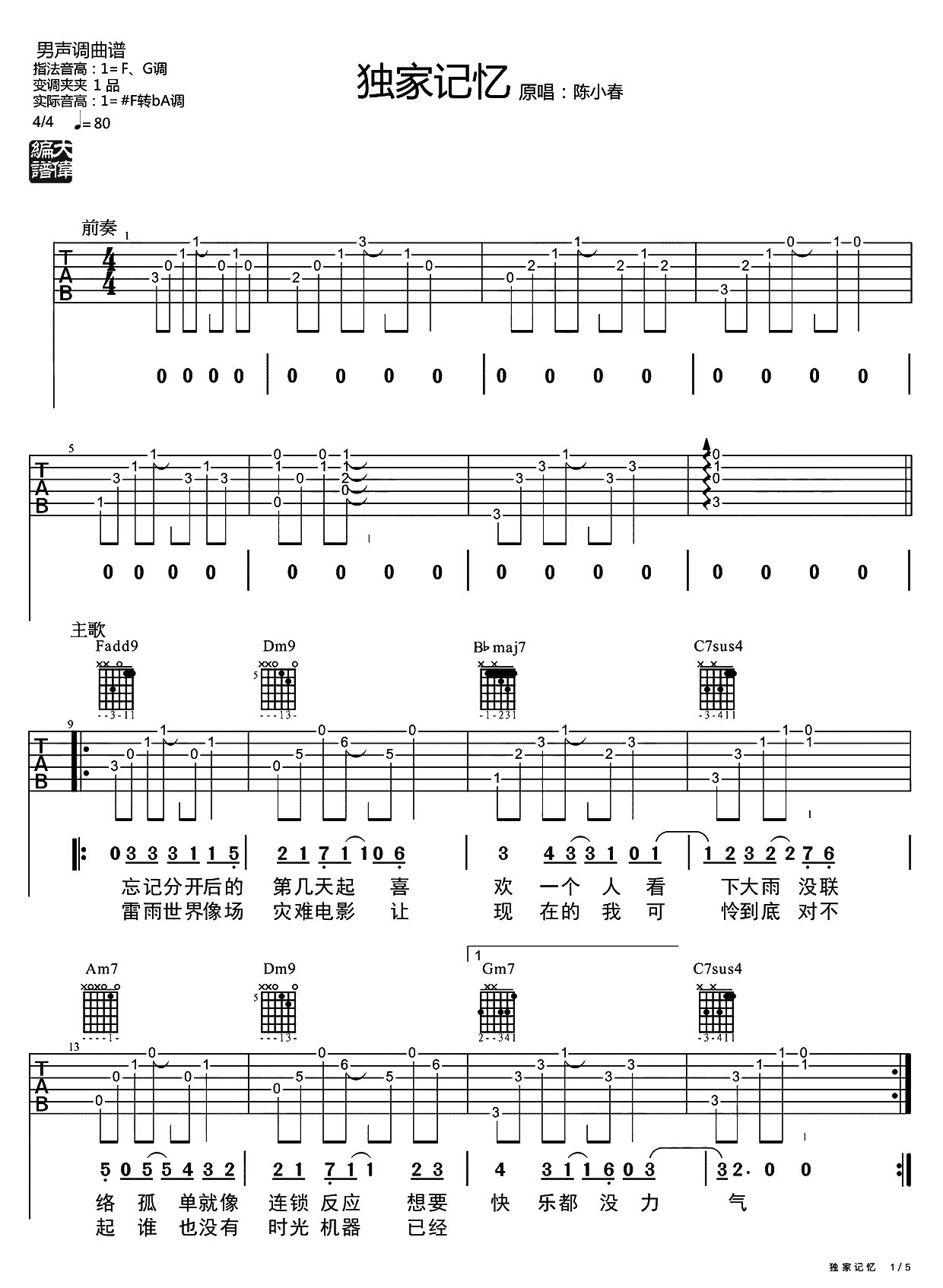 独家记忆吉他谱 - 陈小春 - 吉他弹唱谱 - 原版