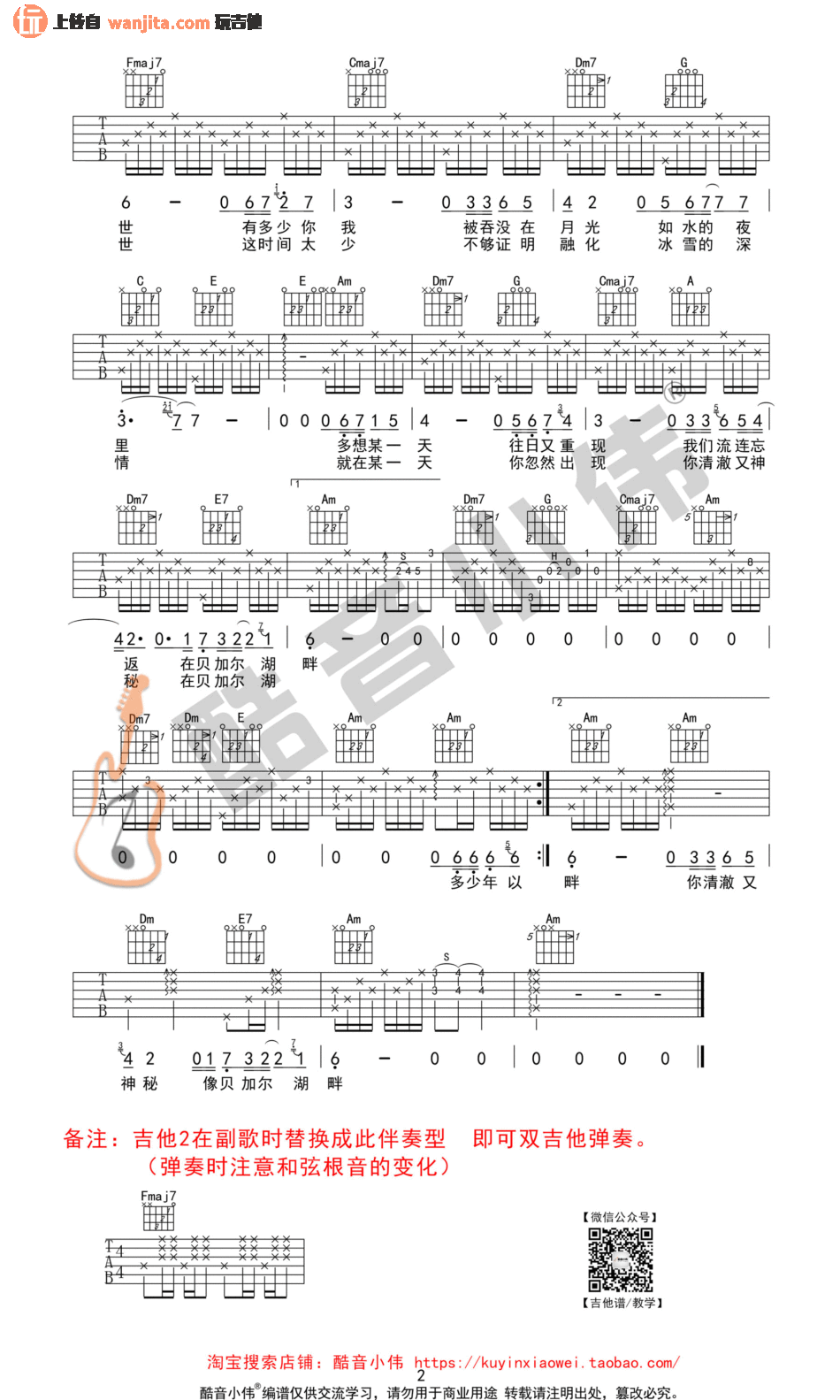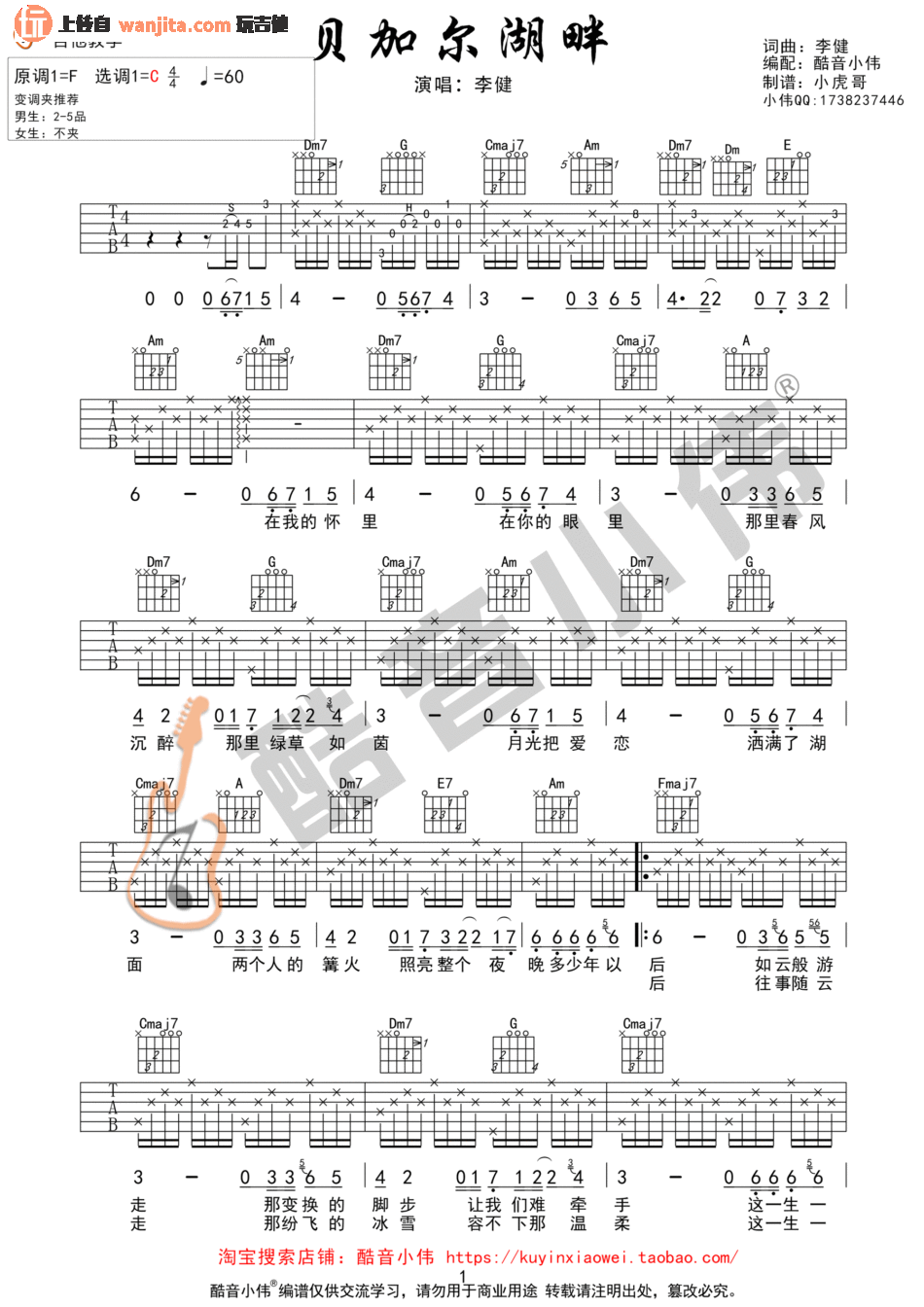曲谱介绍: 由酷音小伟制谱的《贝加尔湖畔》吉他谱,总共2张高清图片谱,选用C调指法,标准调音,男生变调夹2-5品,女生可不夹变调夹,节拍4/4拍,速度60BPM,弹唱难度初级。