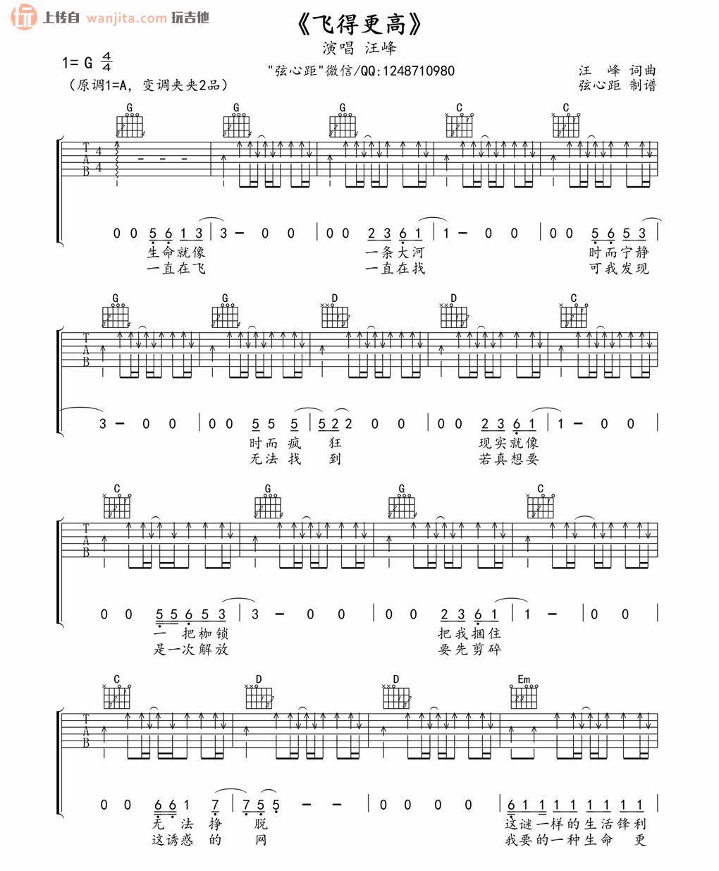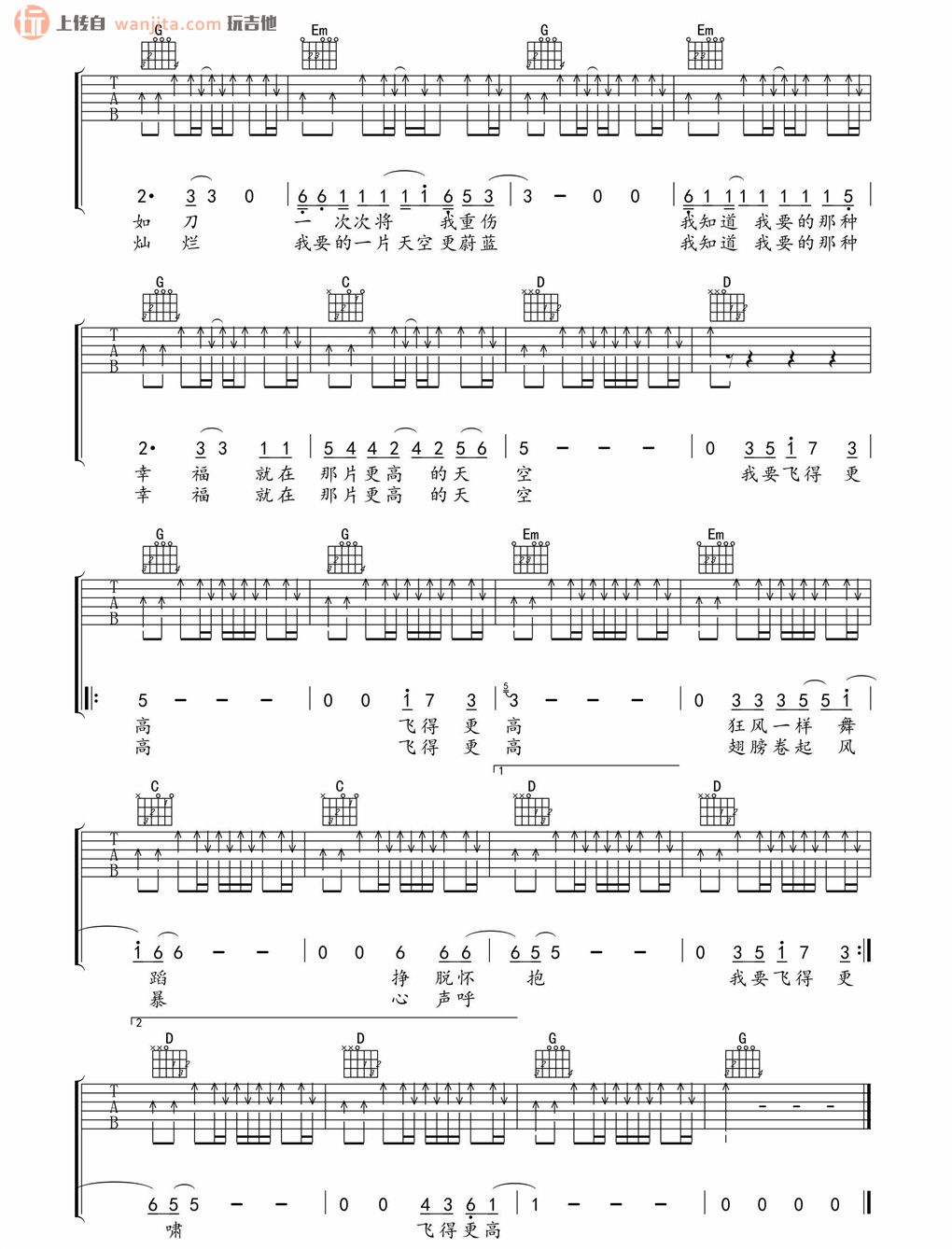 飞得更高吉他谱 - 汪峰 - G调吉他弹唱谱 - 原版