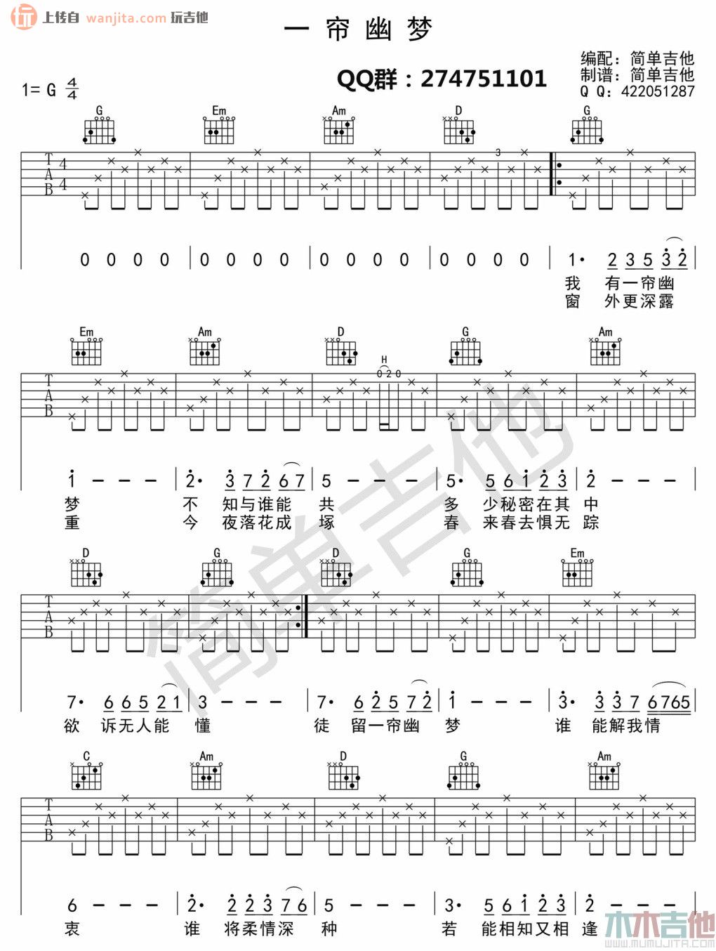 曲谱介绍: 一帘幽梦吉他谱,总共1张高清图片谱,选用G调指法,节拍4/4拍,不使用变调夹,弹唱难度初级。