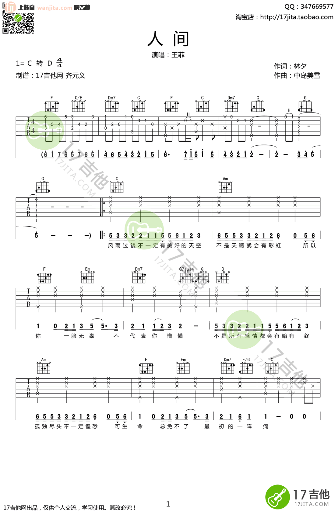人间吉他谱 - 王菲 - C调吉他弹唱谱 - 原版