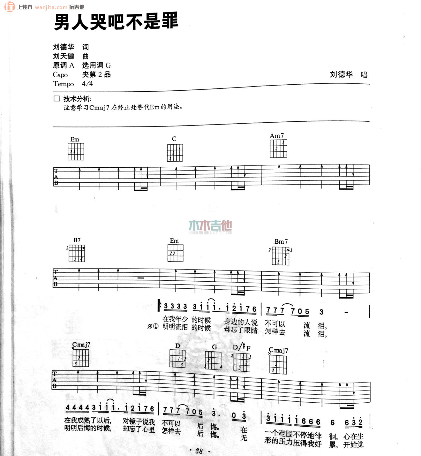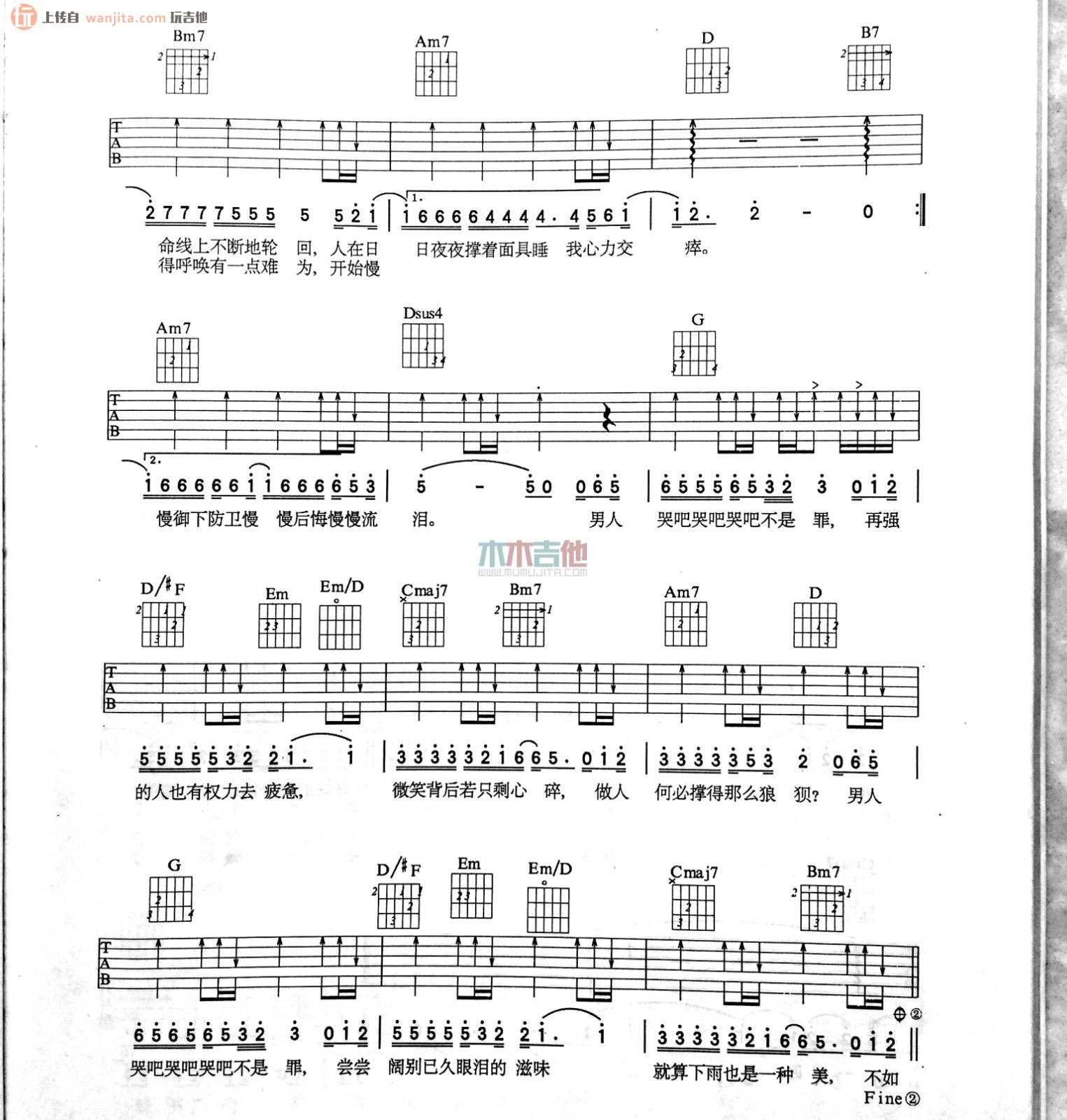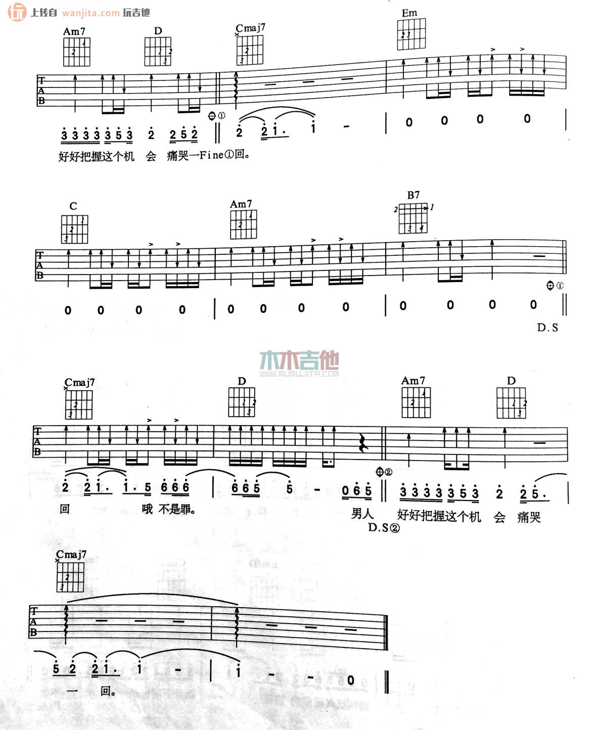 曲谱介绍: 男人哭吧不是罪吉他谱,总共3张高清图片谱,原调是A调,选用G调指法,节拍4/4拍,弹唱建议变调夹夹2品弹唱原曲调,弹唱难度初级,但要注意学习Cmaj7在终止处替代Em的用法。