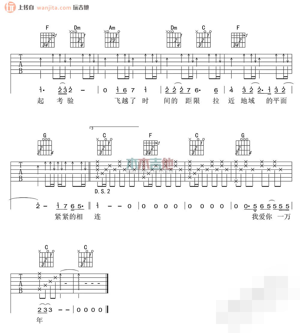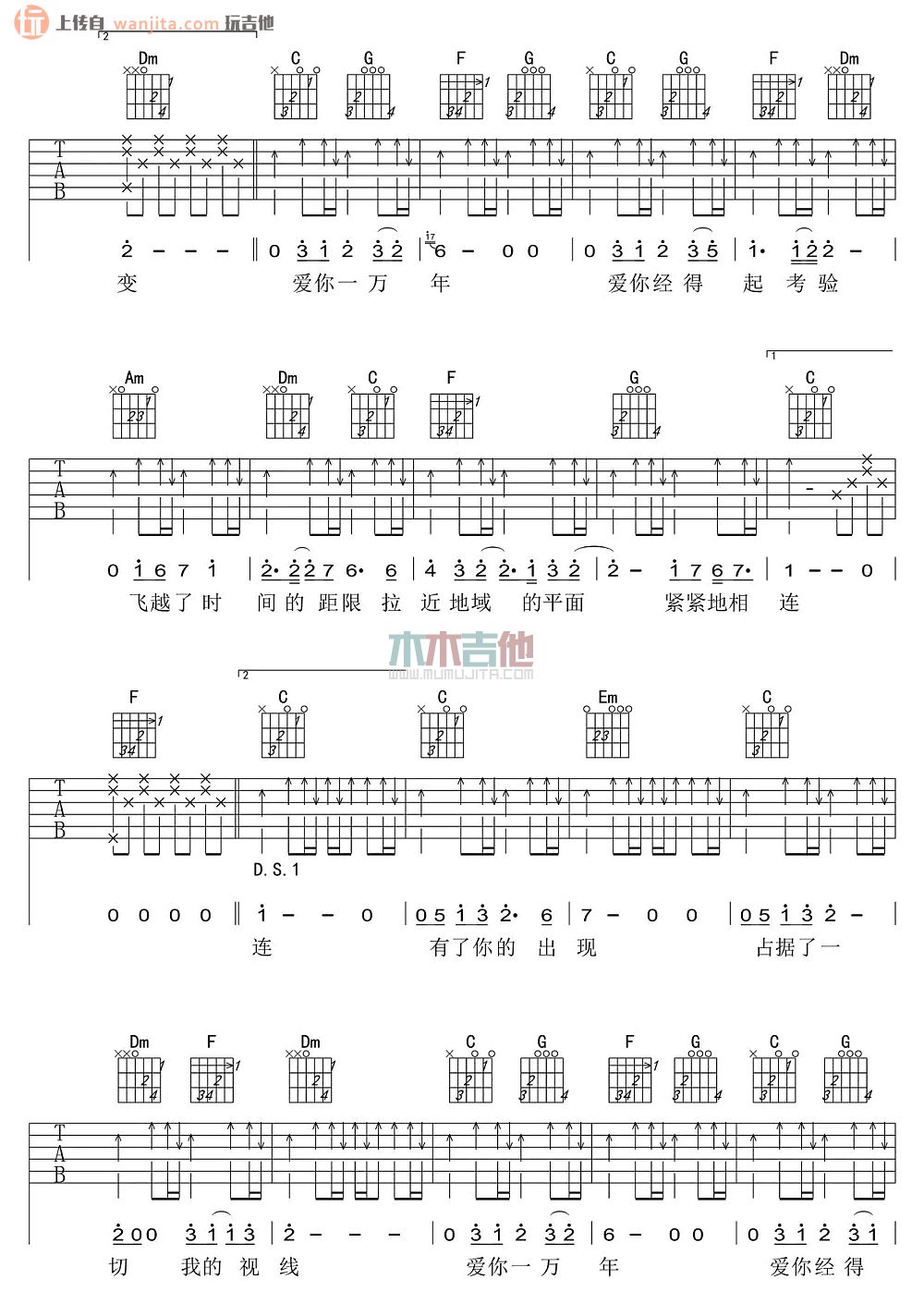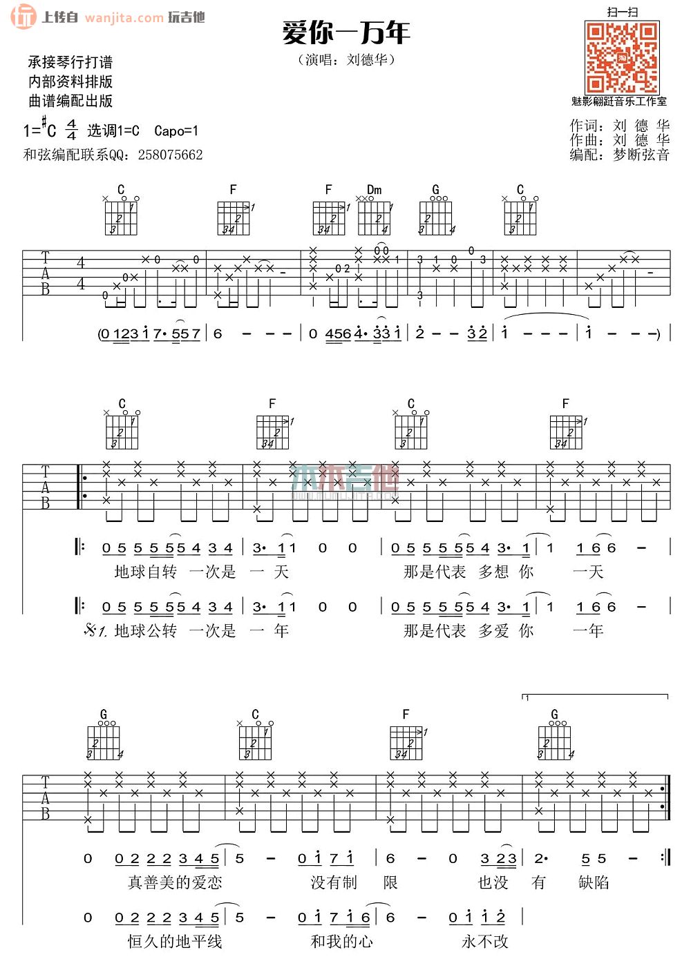 曲谱介绍: 爱你一万年吉他谱,总共3张高清图片谱,原调是升C调,选用C调指法,节拍4/4拍,弹唱建议变调夹夹1品弹唱原曲调,弹唱难度初级,适合新手学习弹唱。