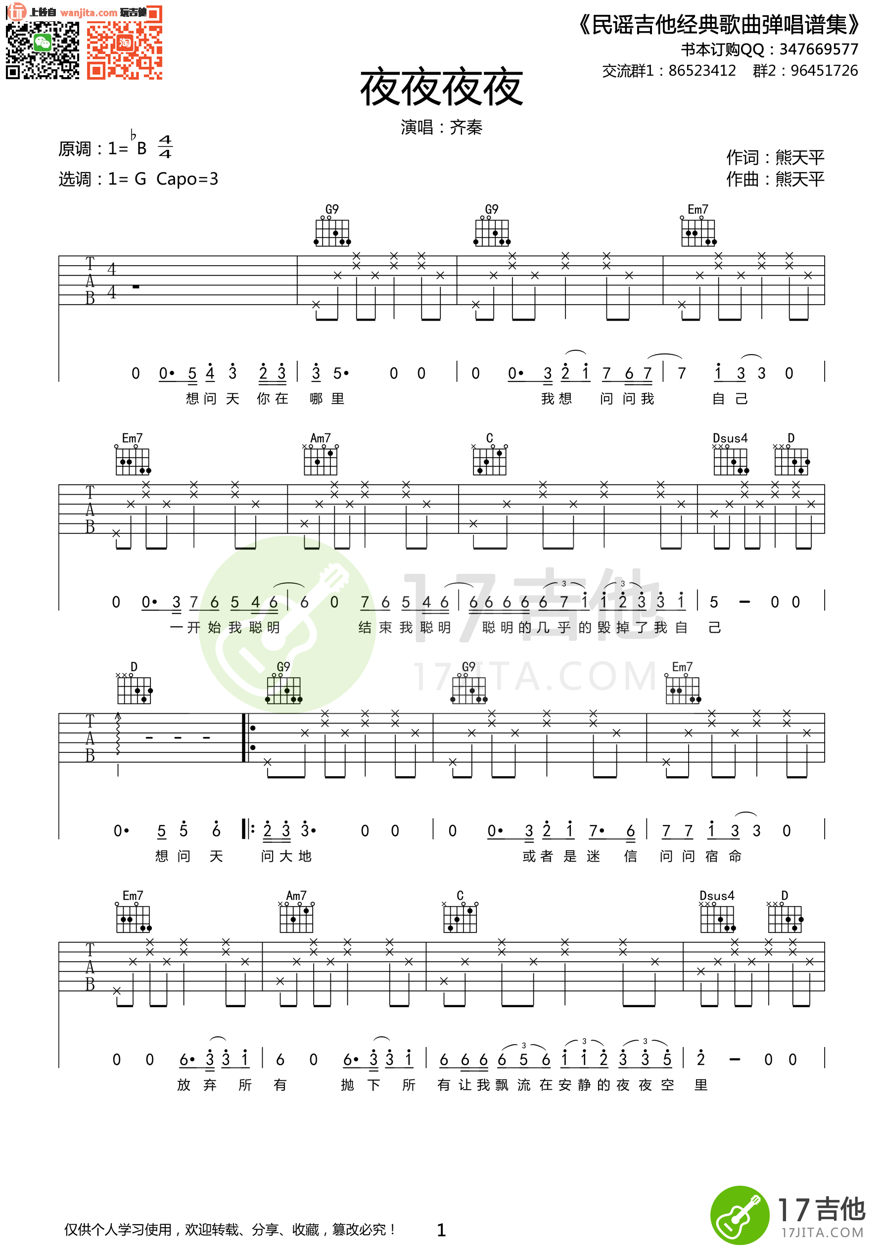 曲谱介绍: 夜夜夜夜吉他谱,总共3张高清图片谱,原调降B调,选用G调指法,节拍4/4拍,弹唱建议变调夹夹3品弹唱原曲调,弹唱难度初级。