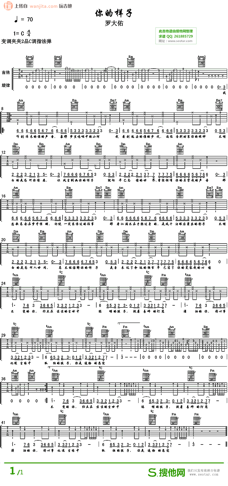 曲谱介绍: 你的样子吉他谱,总共1张高清图片谱,选用C调指法,节拍4/4拍,速度每分钟70BPM,弹唱建议变调夹夹2品弹唱原曲调,弹唱难度初级。