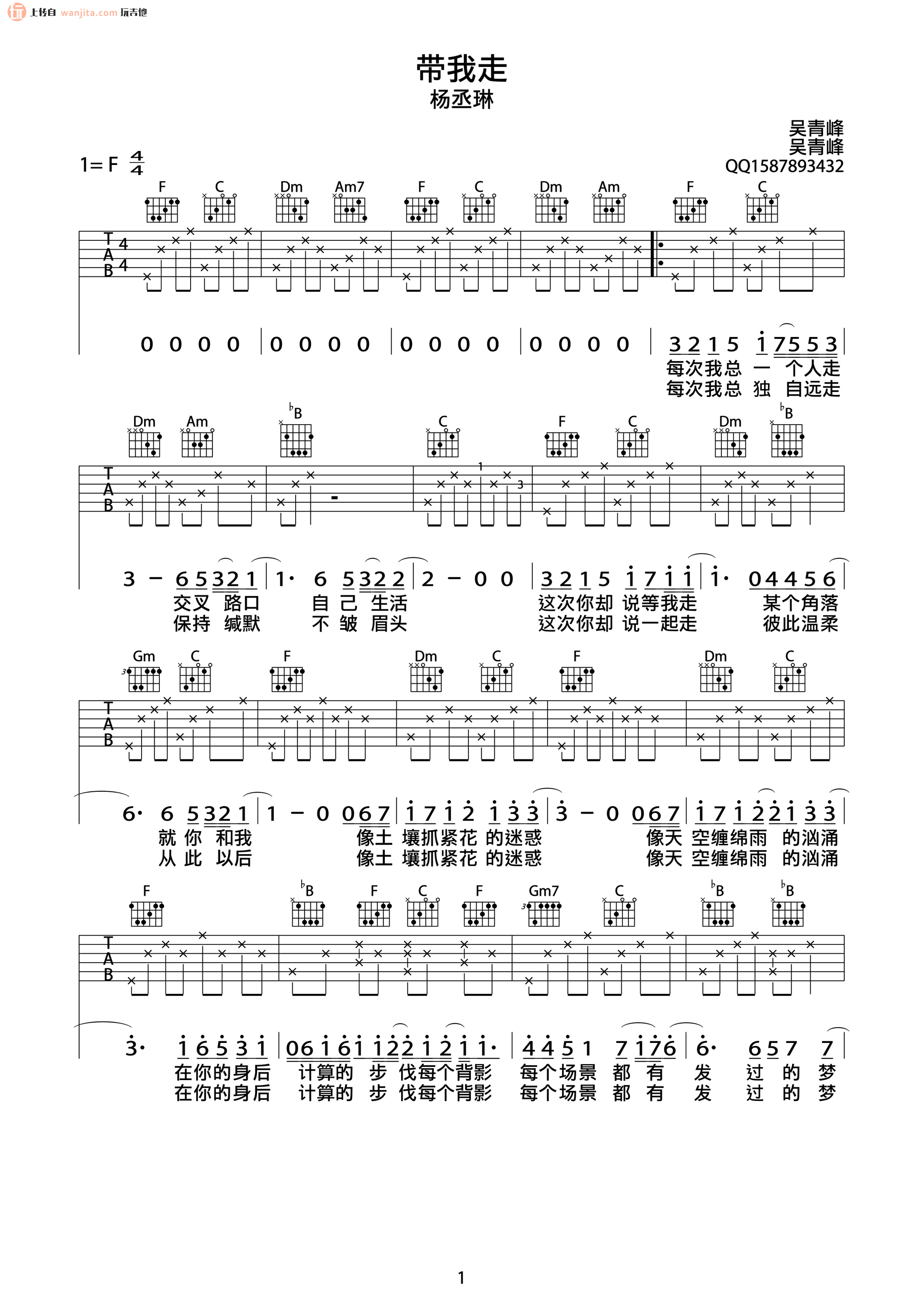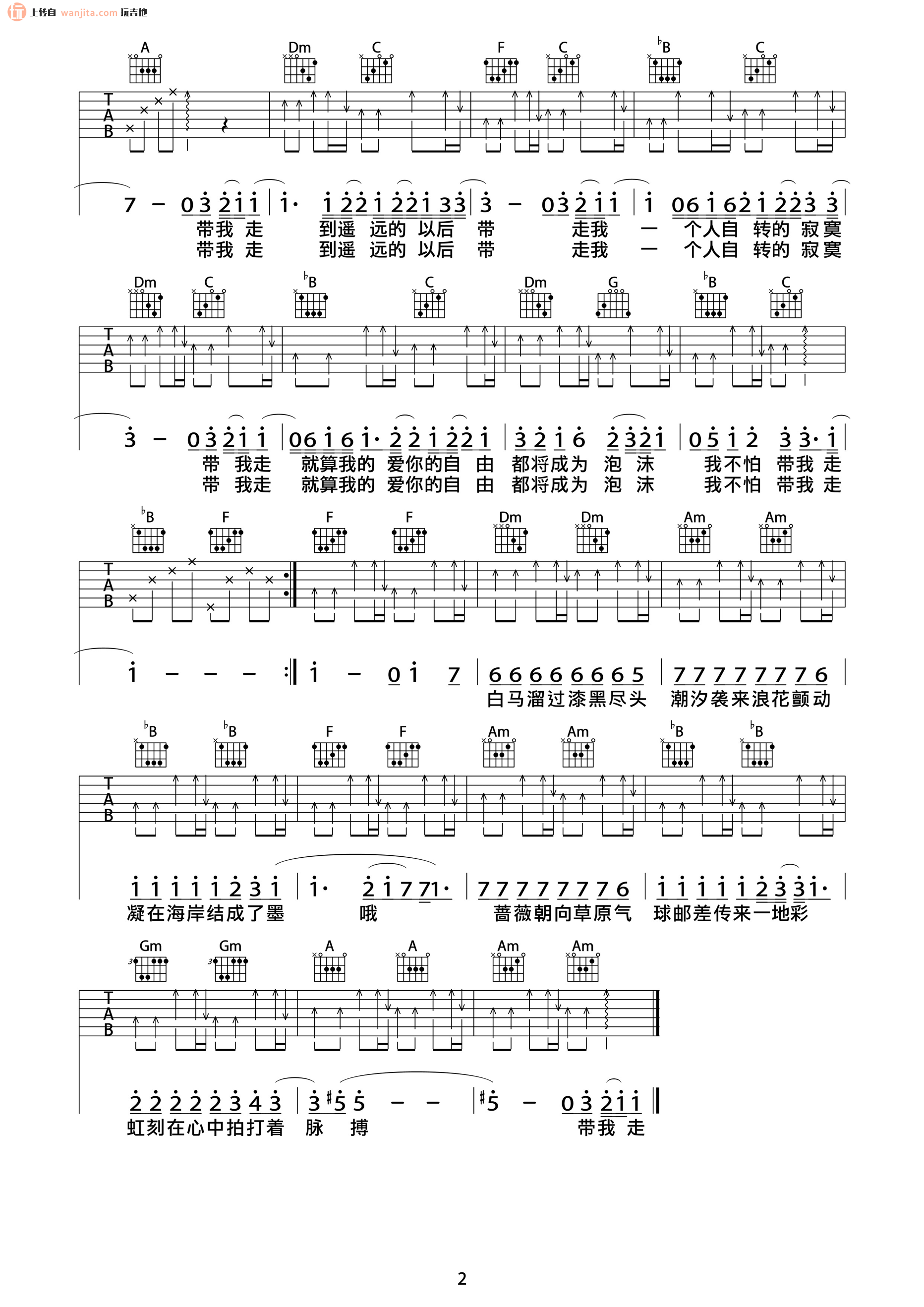 曲谱介绍: 带我走吉他谱,总共2张高清图片谱,选用F调指法,标准调音弹唱,可以不夹变调夹按原曲调弹唱,节拍4/4拍,不使用变调夹,弹唱难度一般。
