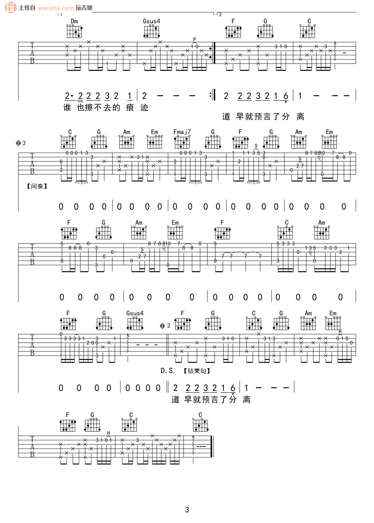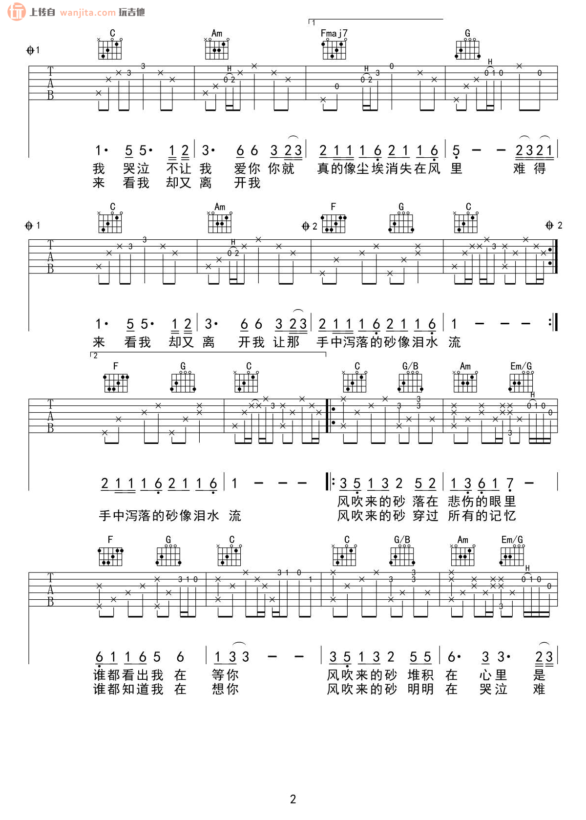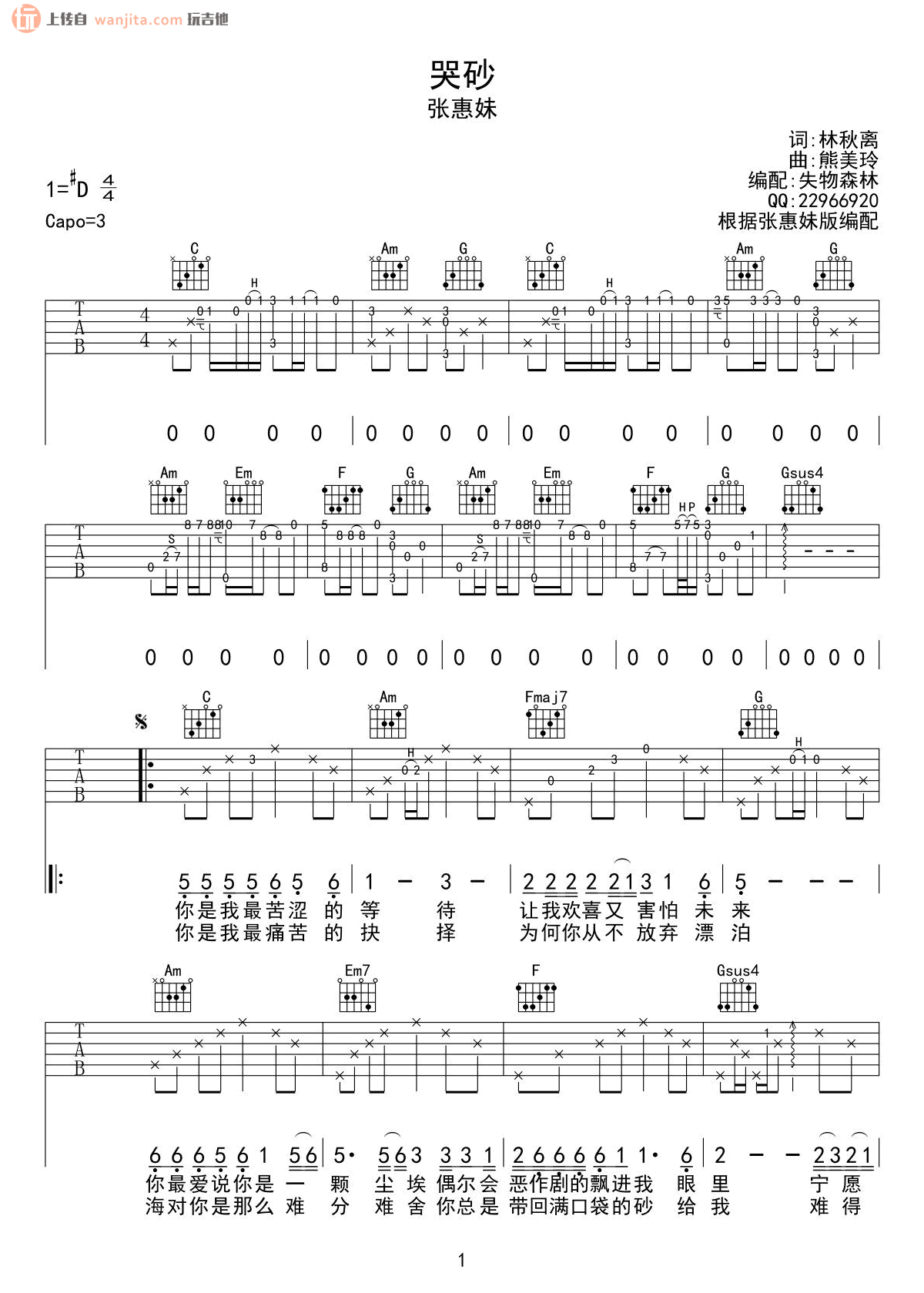曲谱介绍: 张惠妹《哭砂》吉他弹唱谱,共有3张高清图谱。