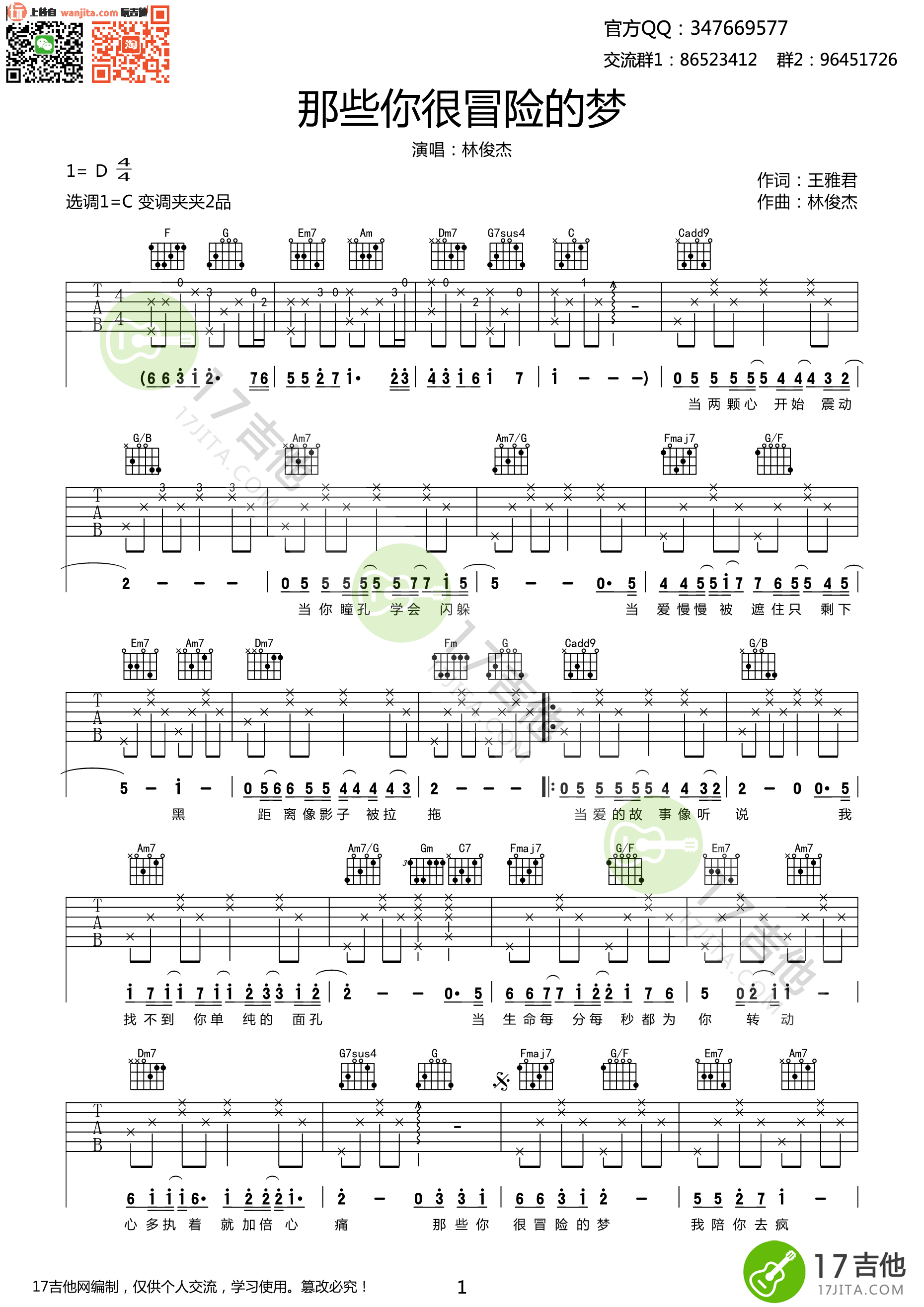 曲谱介绍: 那些你很冒险的梦吉他谱,总共2张高清图片谱,原调是D调,选用C调指法,节拍4/4拍,弹唱建议变调夹夹2品弹唱原曲调,弹唱难度初级。