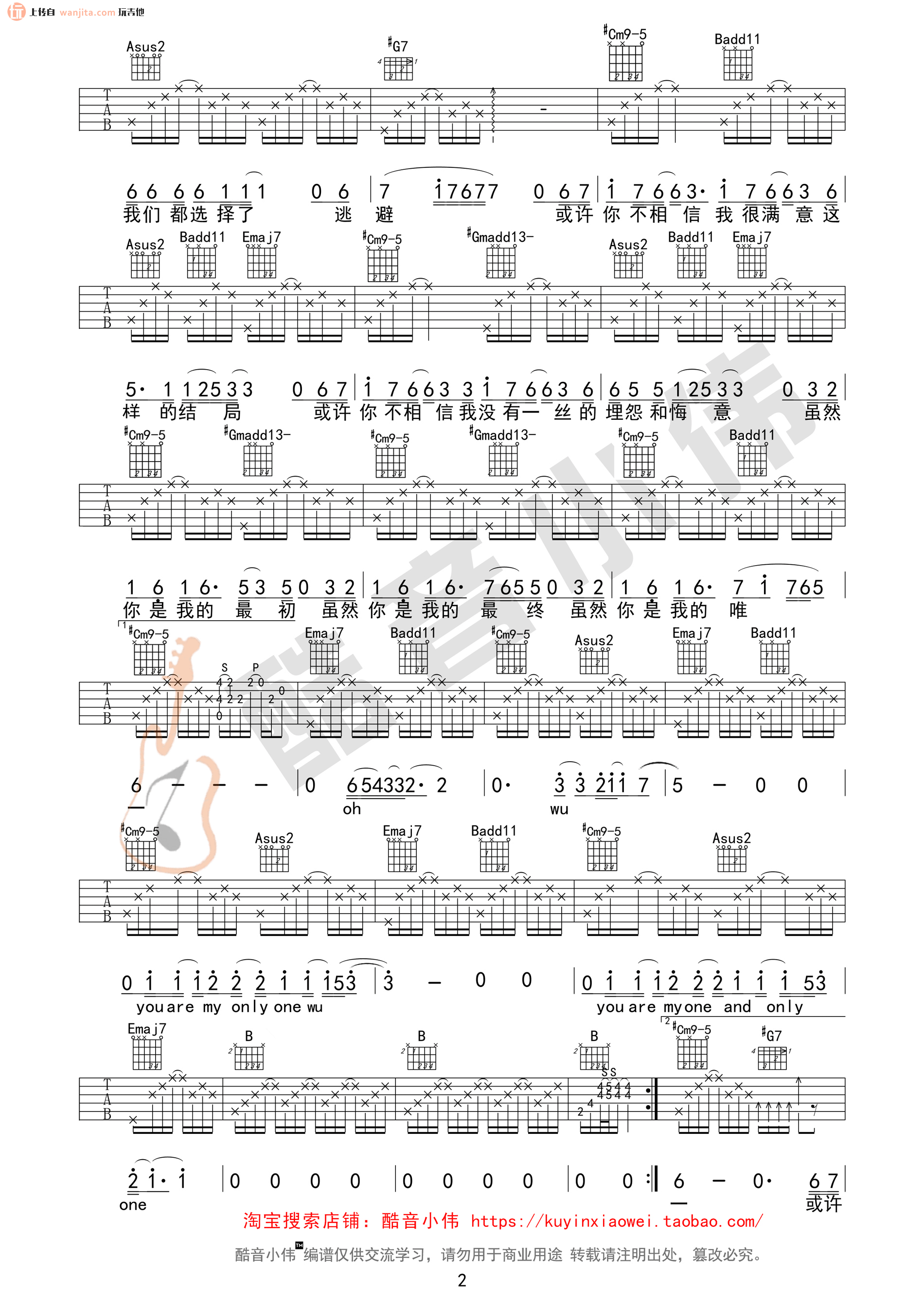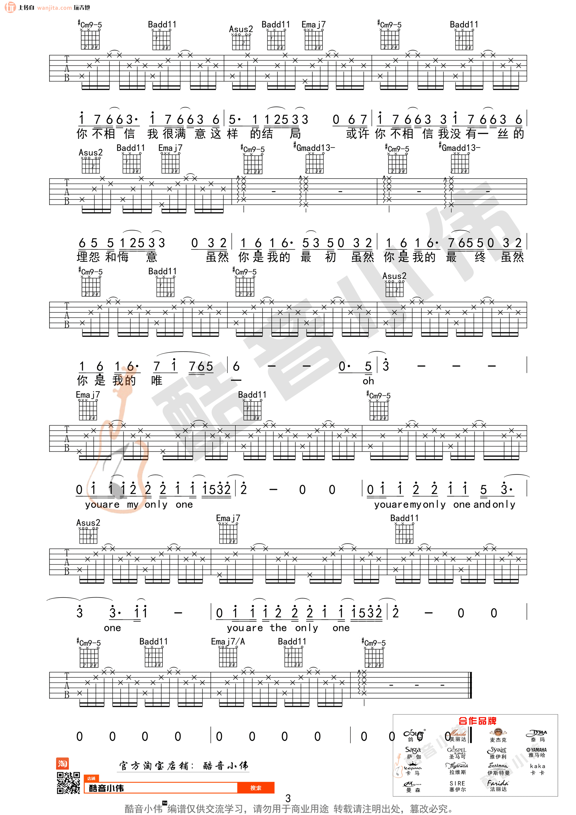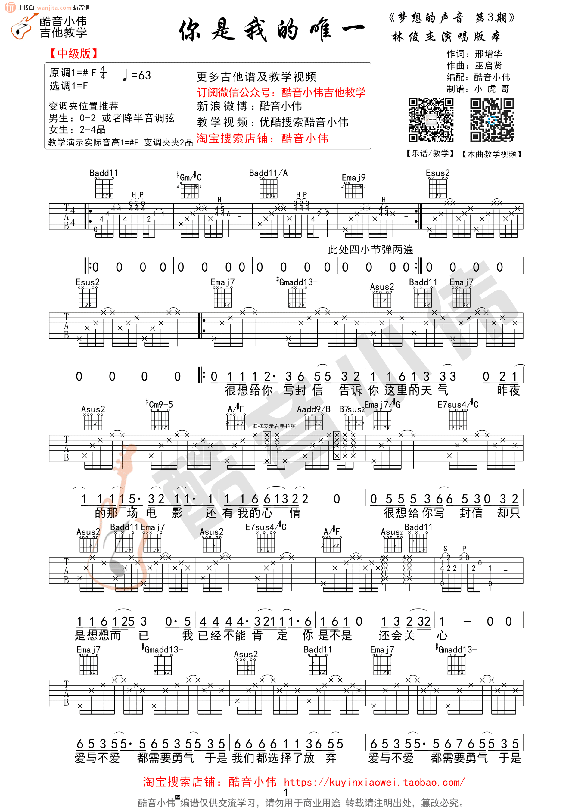 曲谱介绍: 你是我的唯一吉他谱,总共3张高清图片谱,原调是升F调,选用E调指法,节拍4/4拍,速度每分钟63BPM,弹唱建议男生变调夹夹0-2品或降半音调弦,女生变调夹夹2-4品,弹唱难度中级。